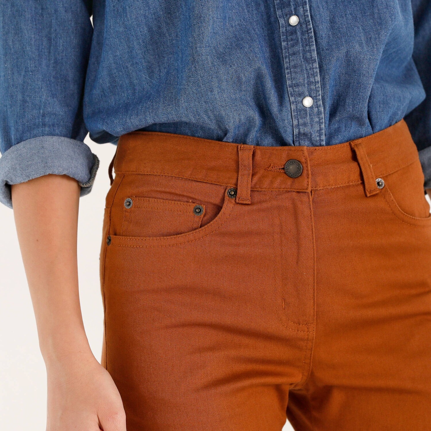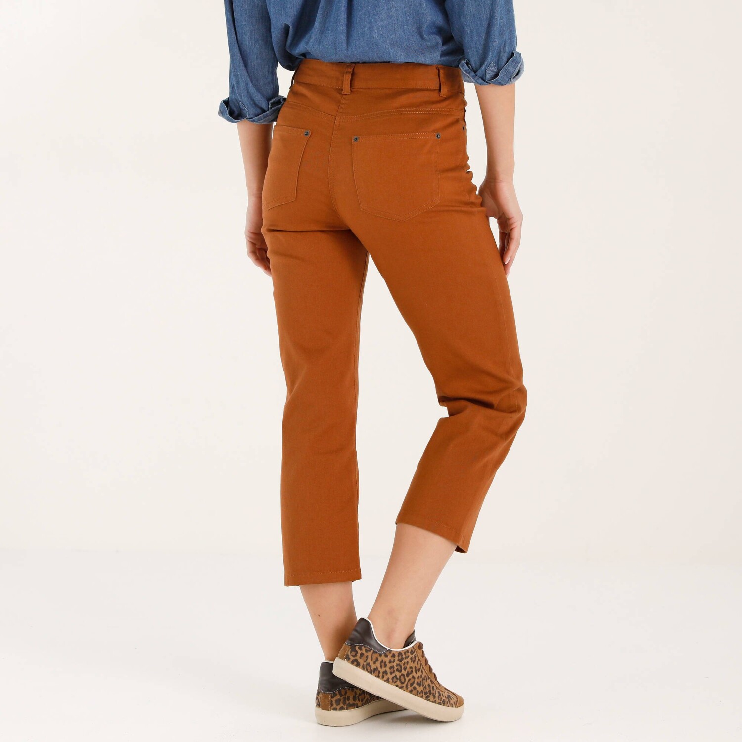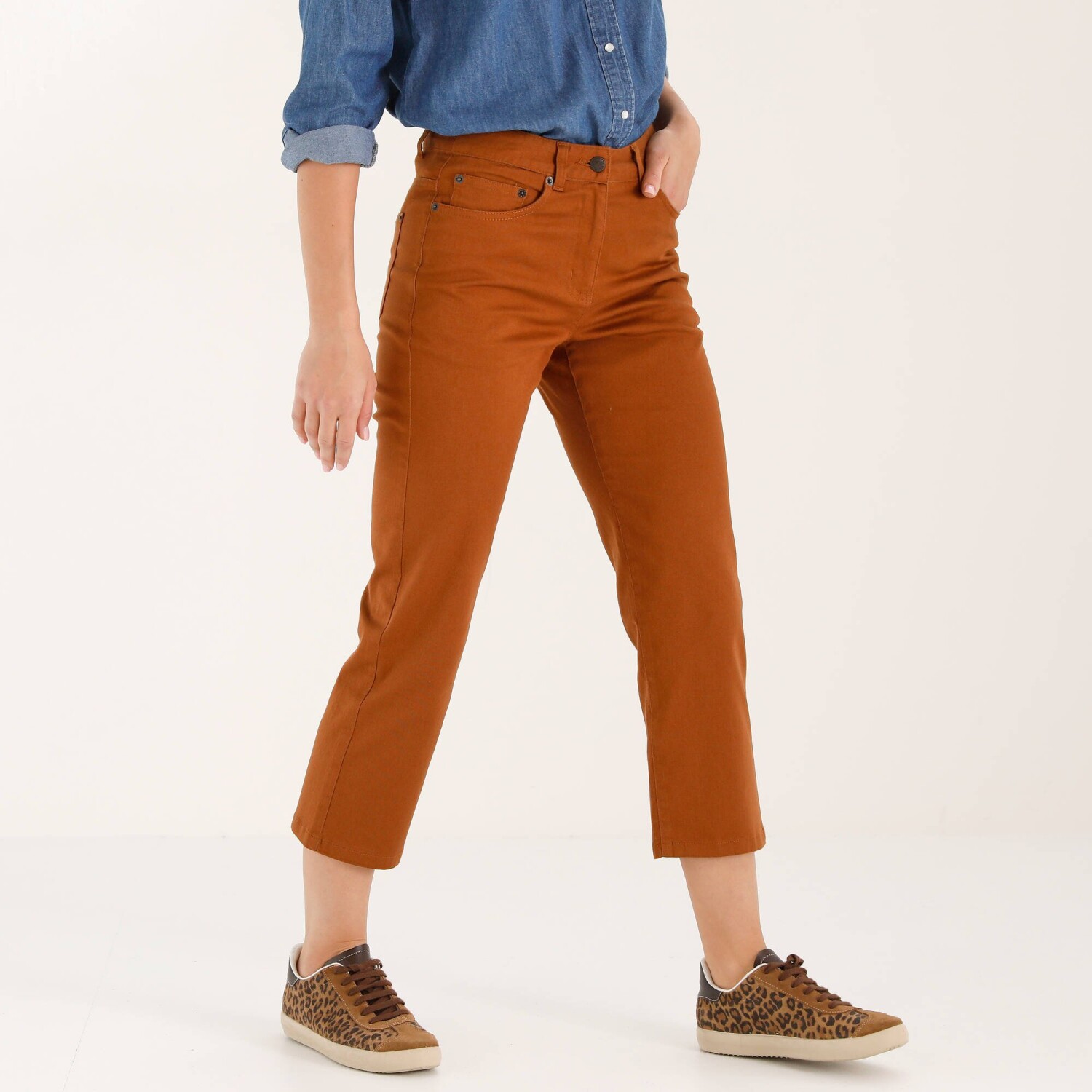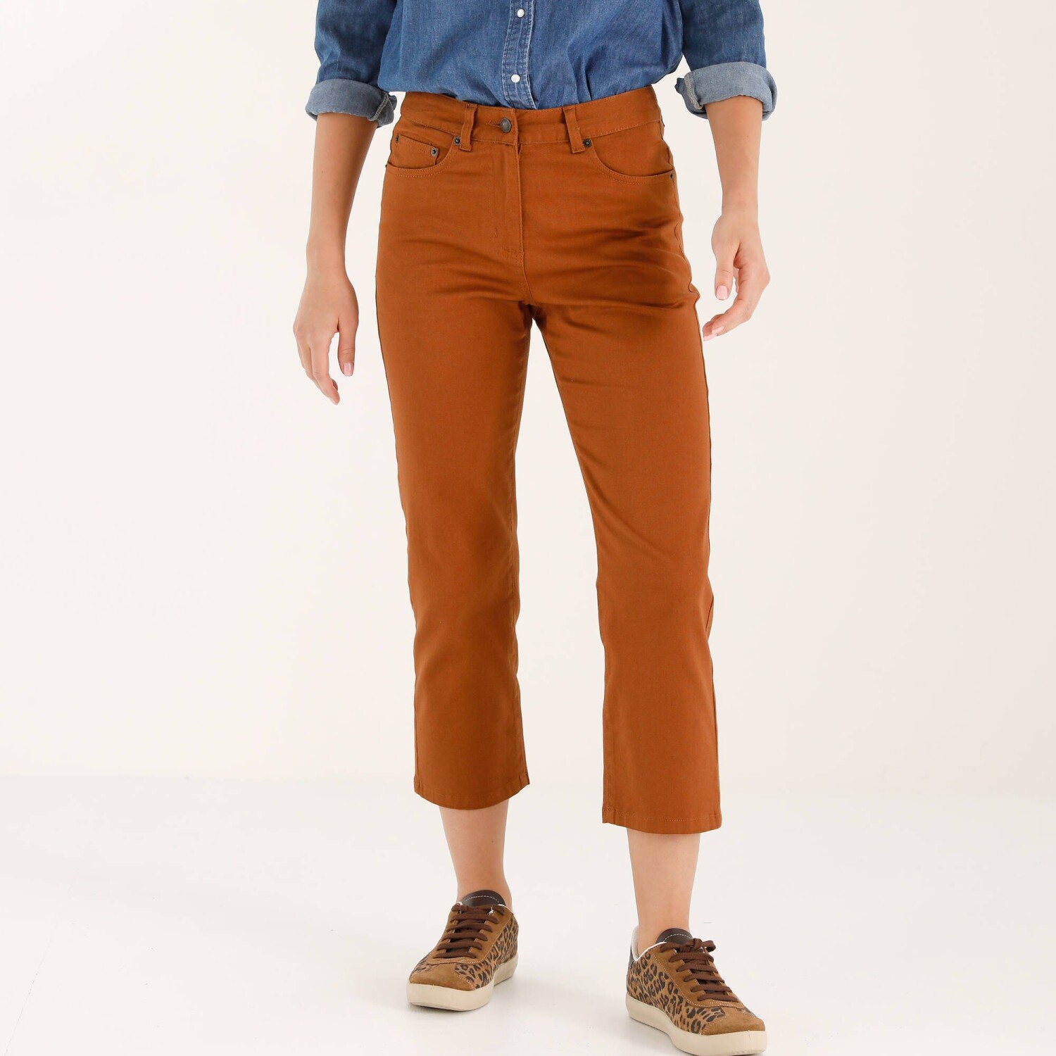V širokej palete farieb, vyberte si rovné 7/8 nohavice vo Vašom obľúbenom odtieni. Rovný strih. Bežná výška pása. Zapínanie na zips a kovový gombík vpredu. 2 vrecká a 1 vrecko s nitmi vpredu. Tvarovaný pás s pútkami. Zvýšený sed. 2 našité vrecká s nitmi vzadu. Certifikát Made In Green značky OEKO-TEX®. Okrem overenia niekoľkých stoviek chemických látok (STANDARD 100), čím prispieva k vysokej bezpečnosti, toto označenie zaručuje ohľaduplné výrobné princípy a kontrolované spoločenské postupy (certifikát STeP). Možno prať v práčke.