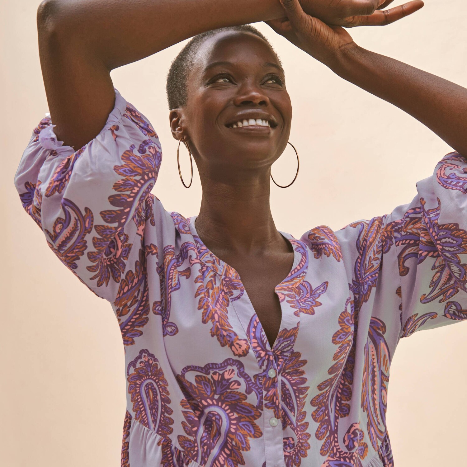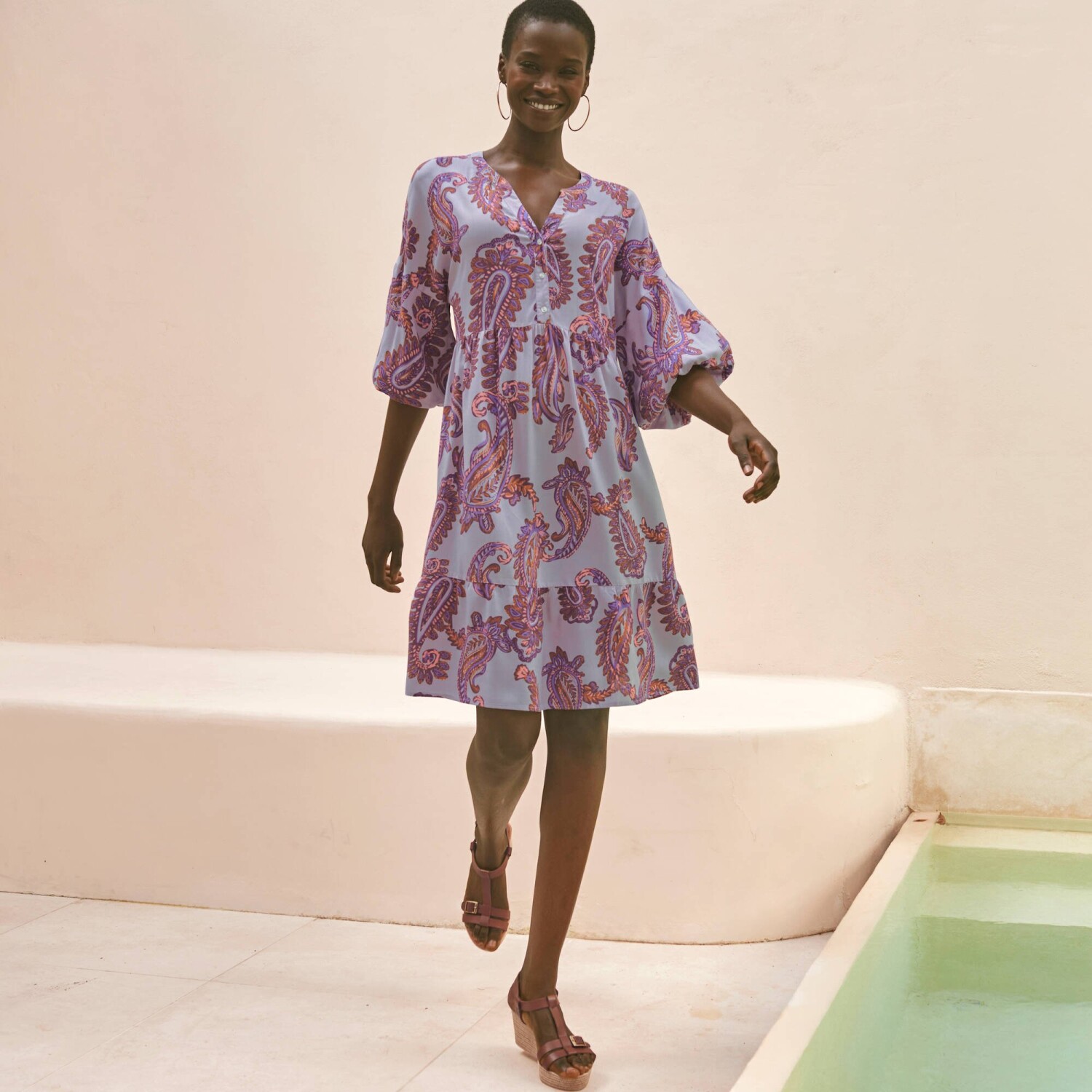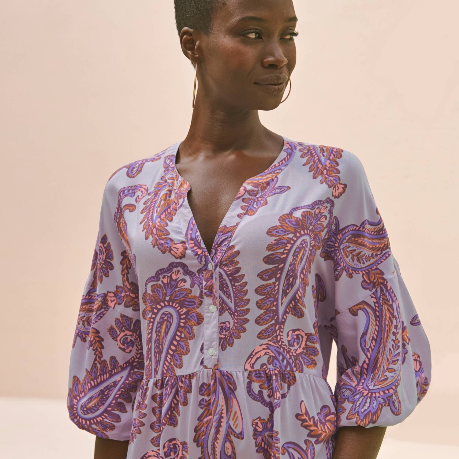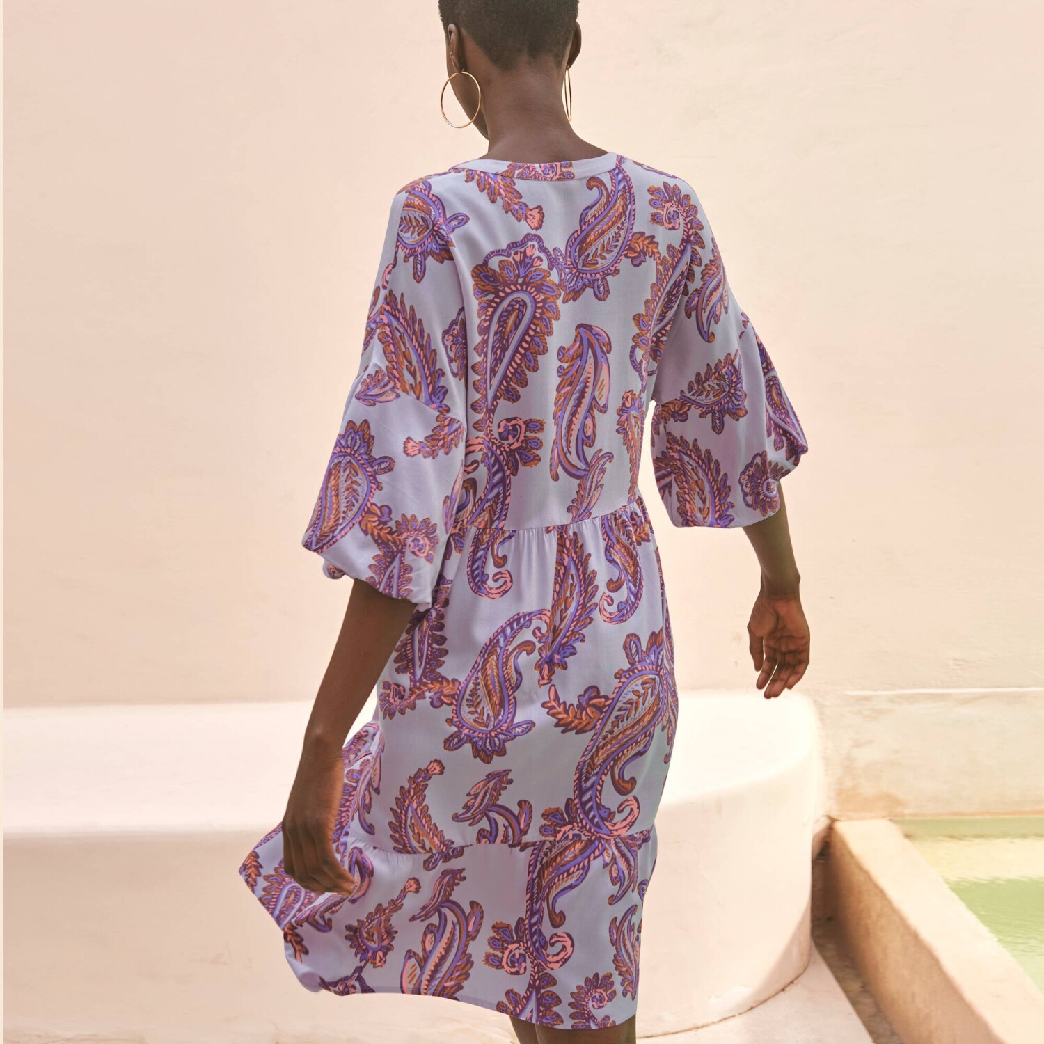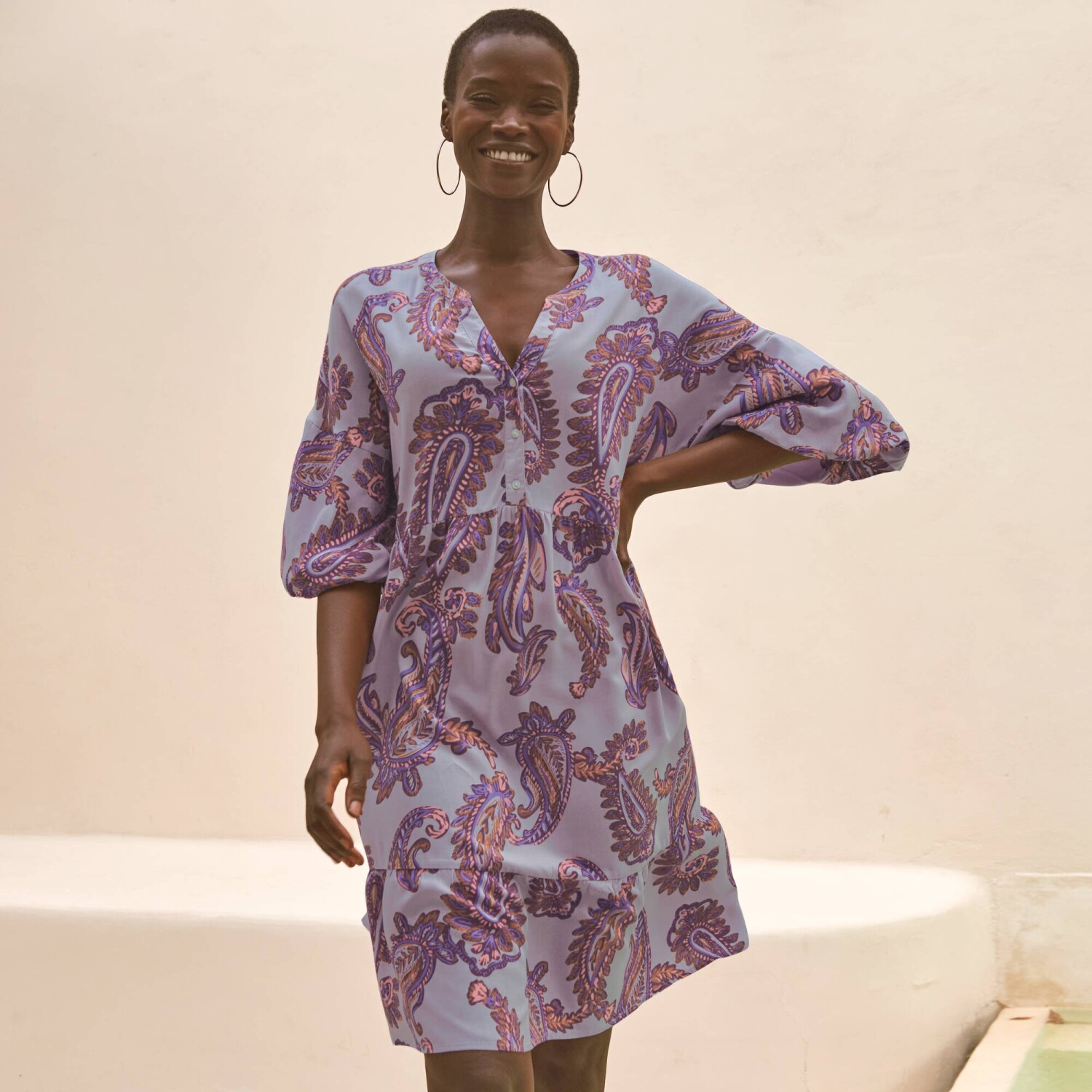 Vo voľnom strihu s krásnym paisley vzorom, zamilujte si boho štýl v podobe štýlových šiat. Dĺžka nad kolená. Tuniský výstrih s gombíkovou légou až po prestrih v páse. Voľné plecia. Nadýchané rukávy. Rozšírený dolný lem s volánmi. Možno prať v práčke.