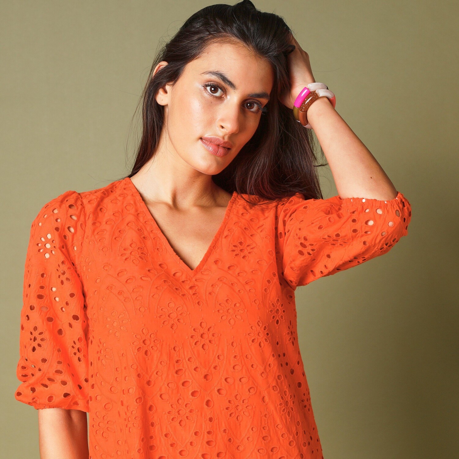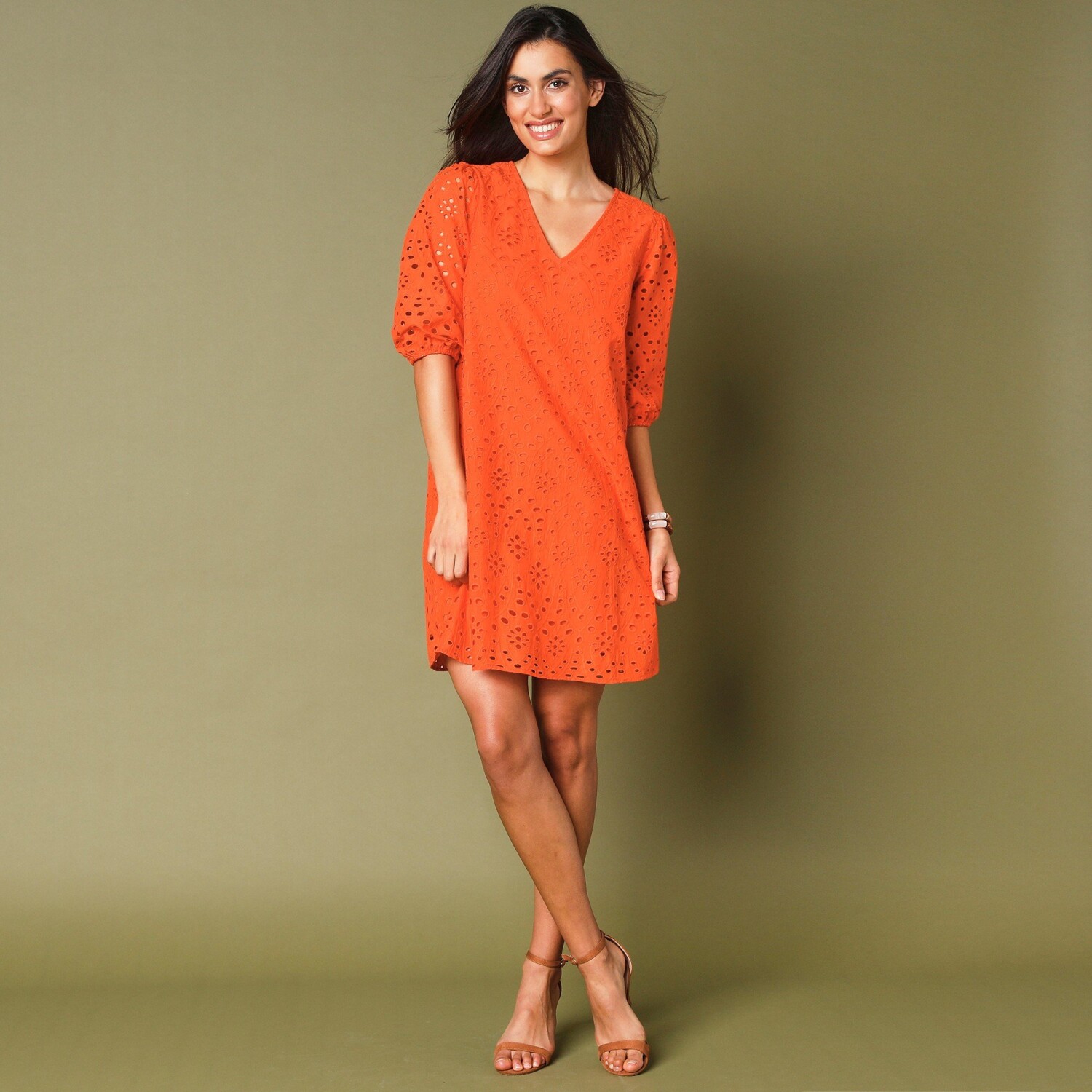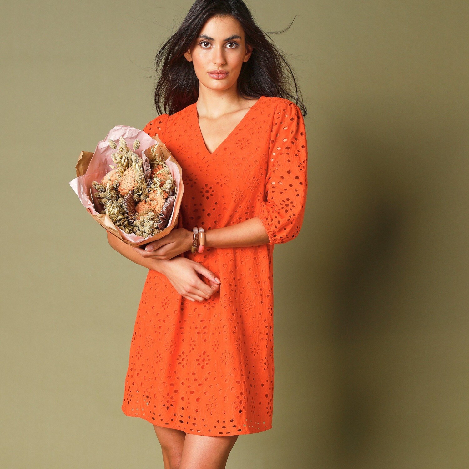 Šaty s anglickou výšivkou pristanú každej žene! S nadýchanými rukávmi a krásnou výšivkou, je ťažké im odolať. Dĺžka nad kolená. Výstrih do "V" s lemovkou. 3/4 rukávy zúžené na lakťoch s nadýchaným efektom. Rovný spodný lem. Možno prať v práčke.