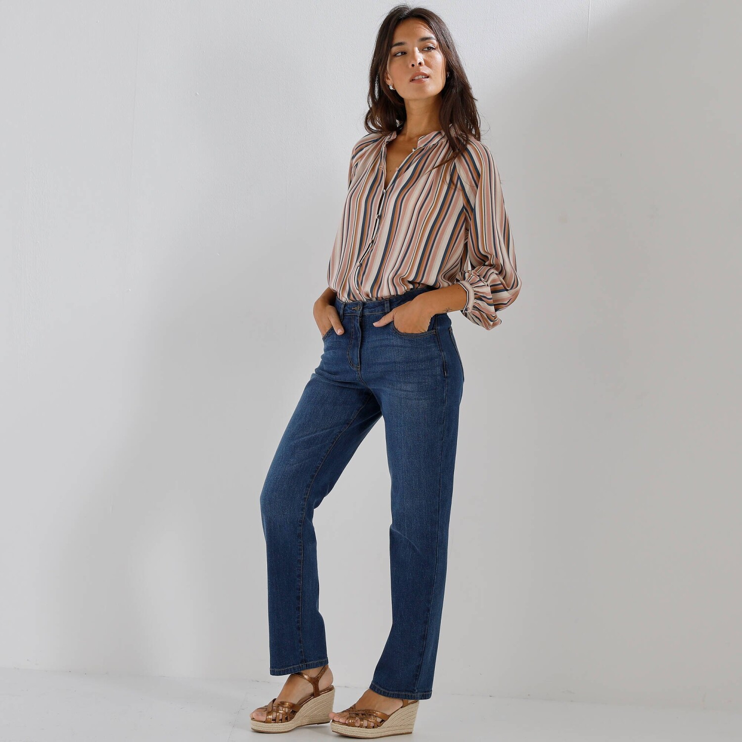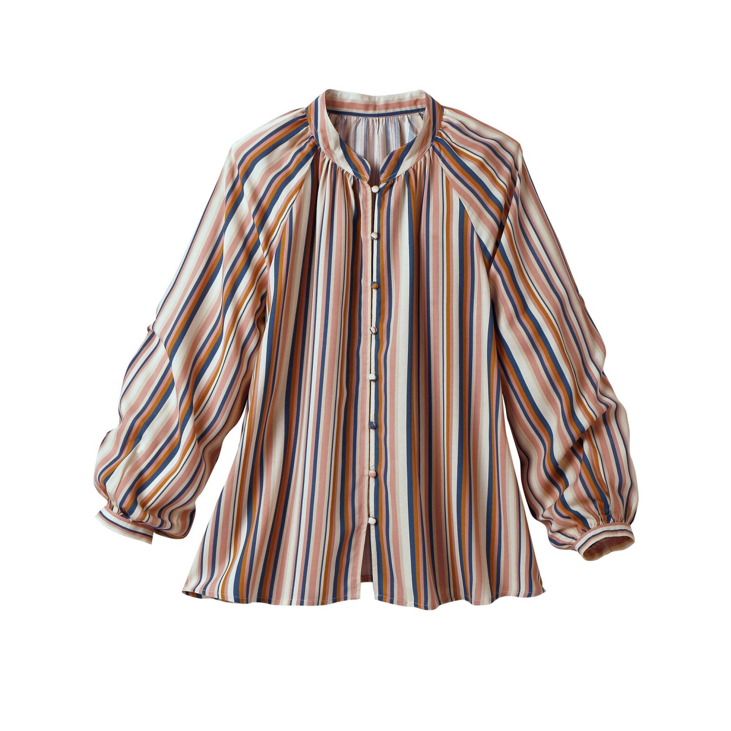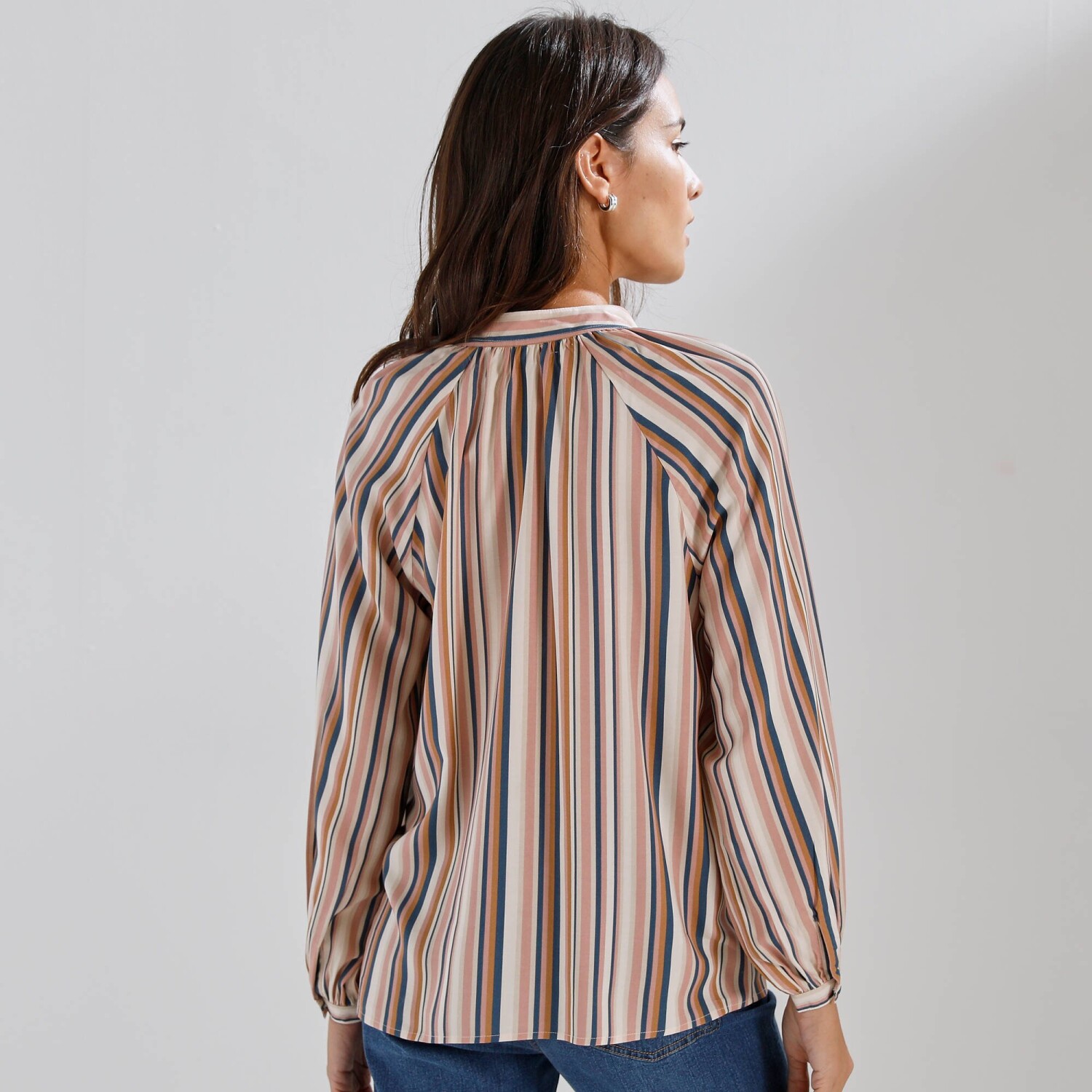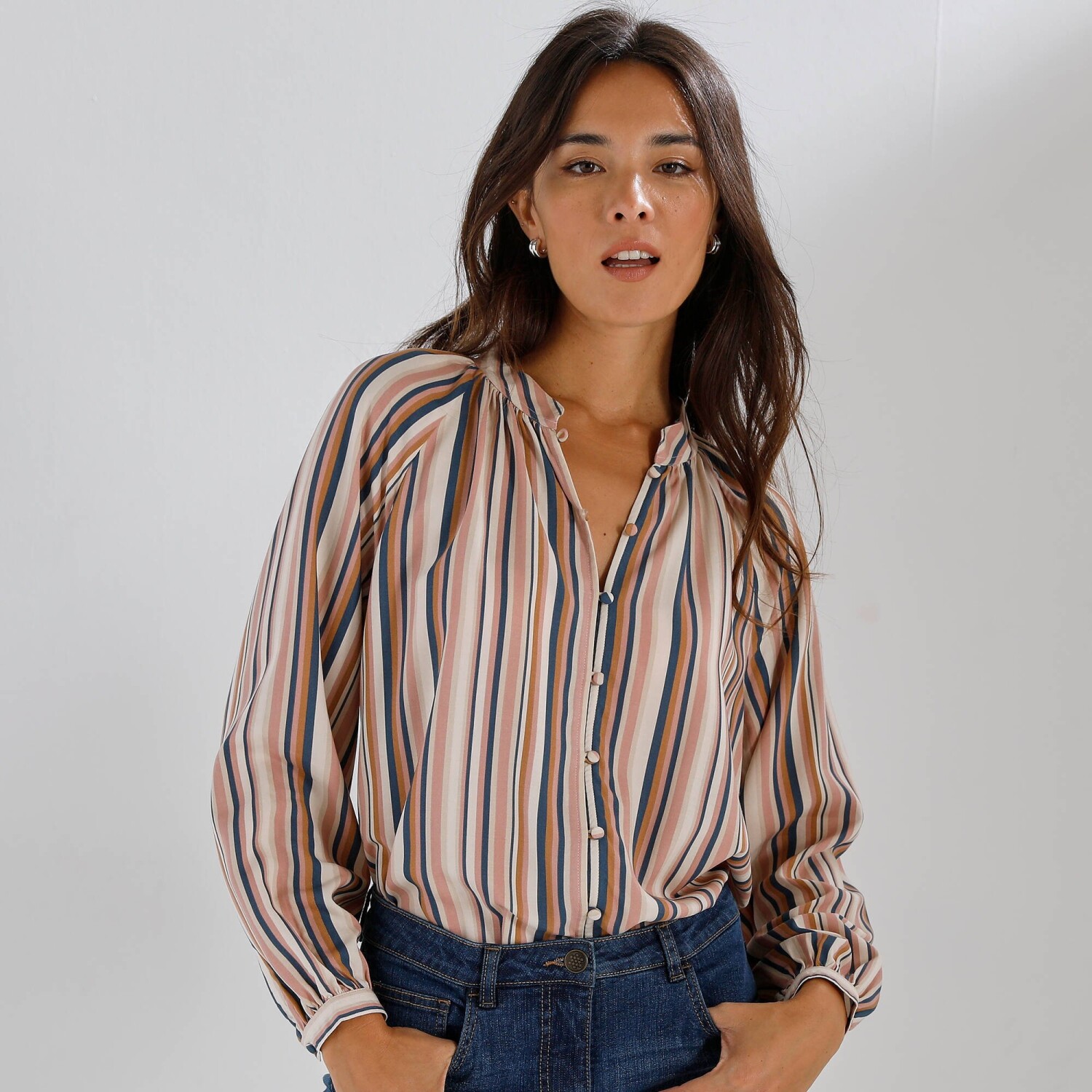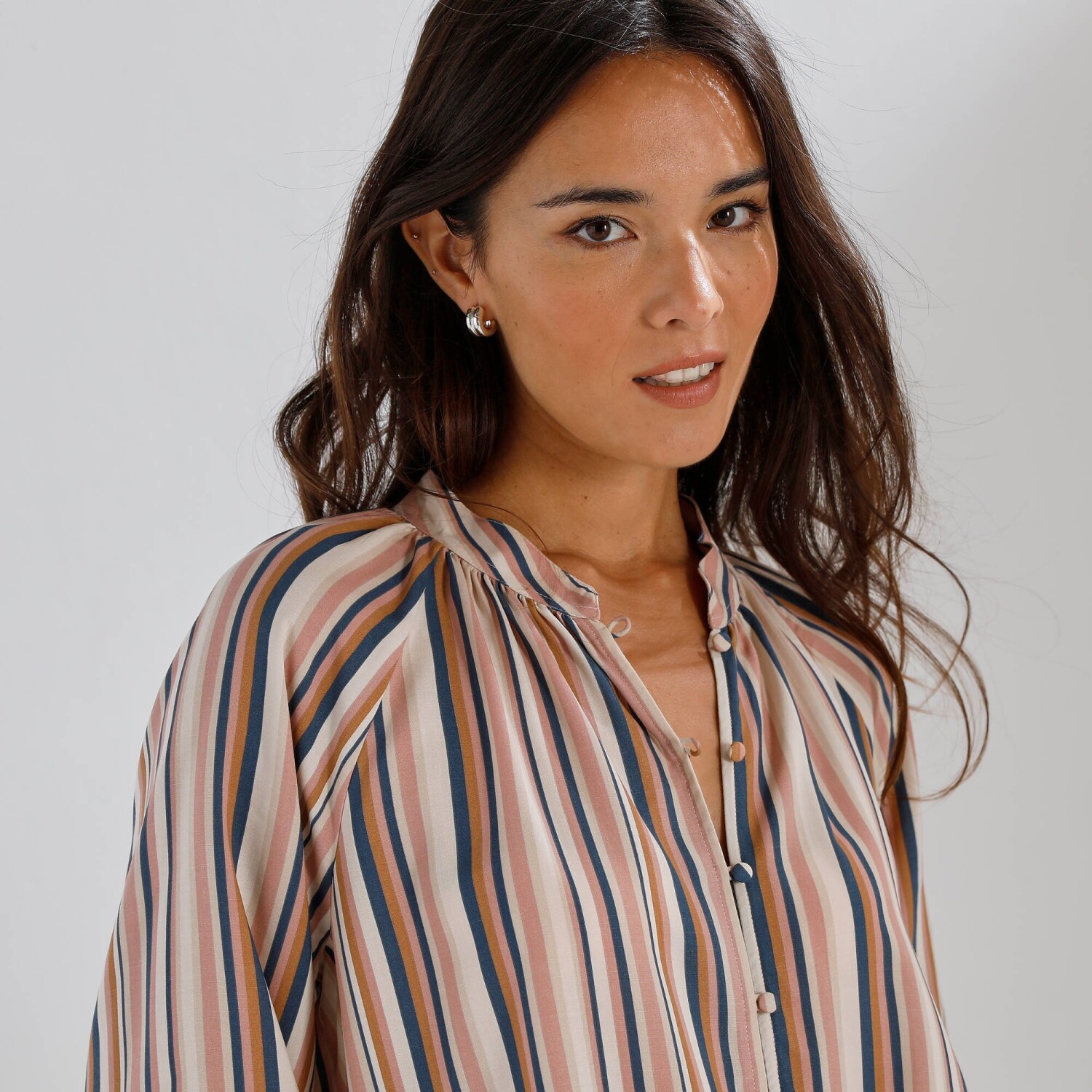Ľahká a voľná blúzka s nadýchanými rukávmi je ideálna na slnečné dni! Zamilujete si jej krásny objem a zvislé pruhy, ktoré elegantne predlžujú siluetu. Čerešničkou na torte je príjemne splývavý materiál, ktorý sa skvele hodí na každodenné nosenie. Nariasený stojačik. Vpredu gombíky a očká. Dlhé raglánové rukávy s gombíkmi. Manžety na gombík. Mierne rozšírený dolný lem. Standard 100 by Oeko-Tex (n° CQ 1216 / 3 IFTH). Táto známka označuje textilné výrobky, ktoré boli podrobené laboratórnym testom na široké spektrum škodlivých látok a výrobok je bezpečný nad rámec platných noriem. Možno prať v práčke.