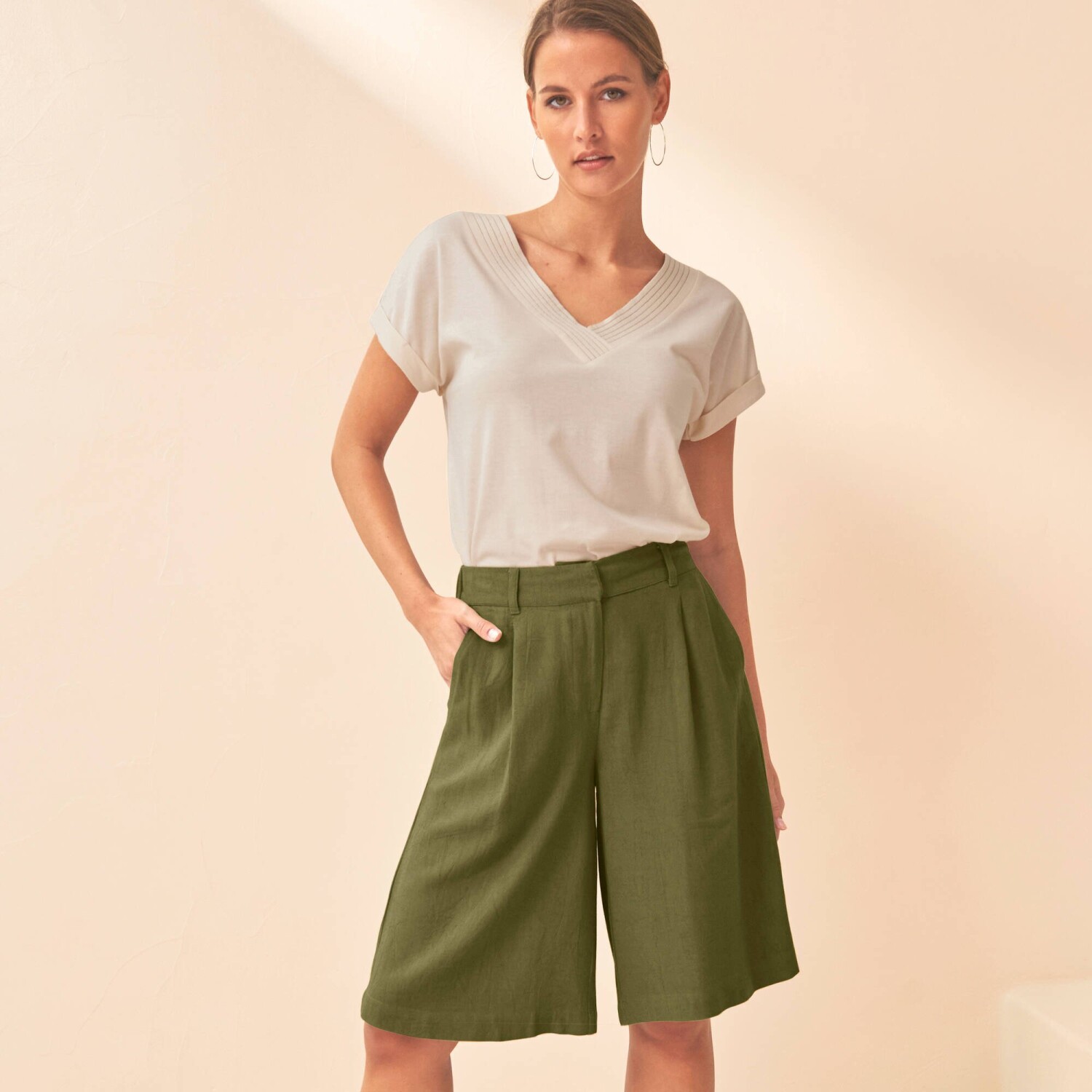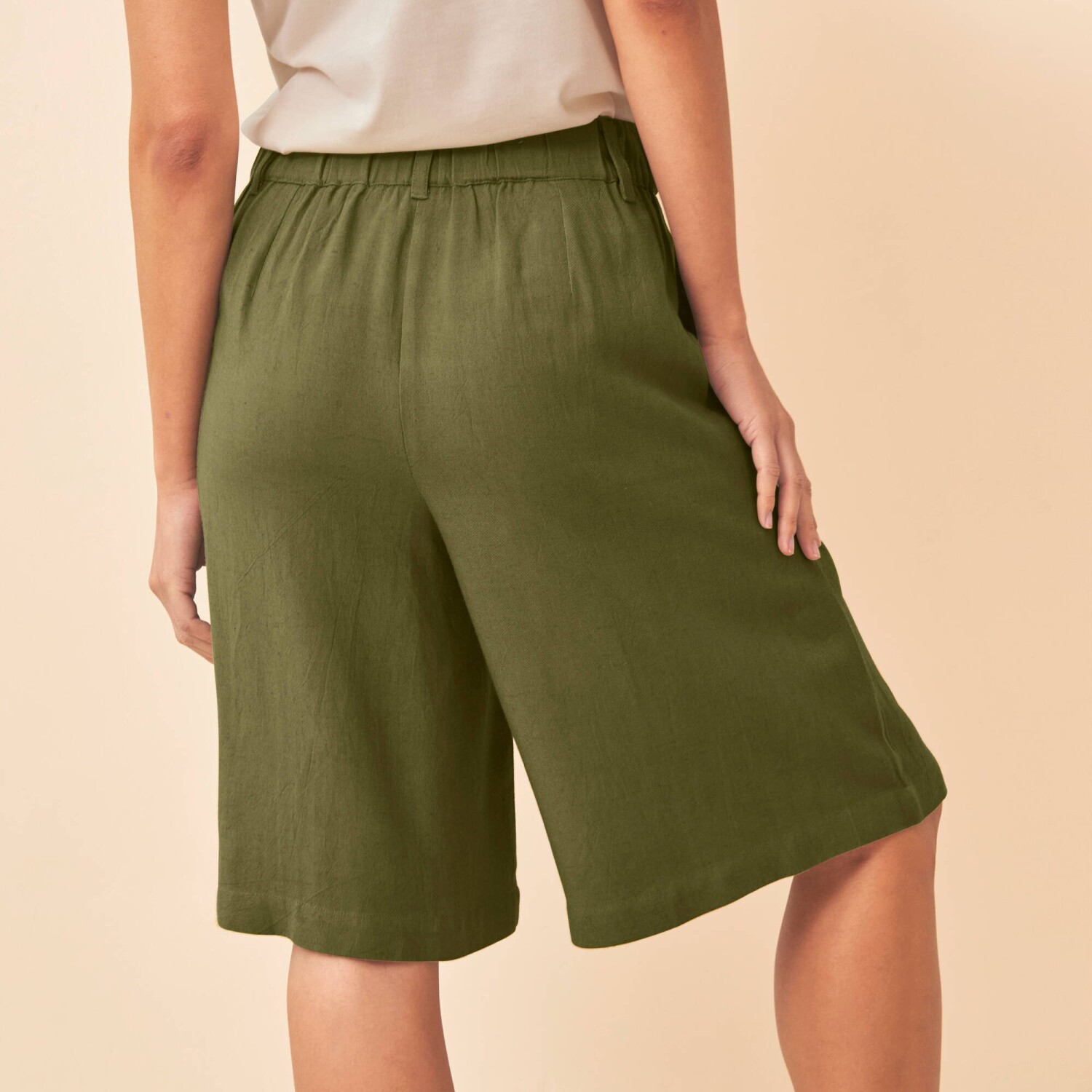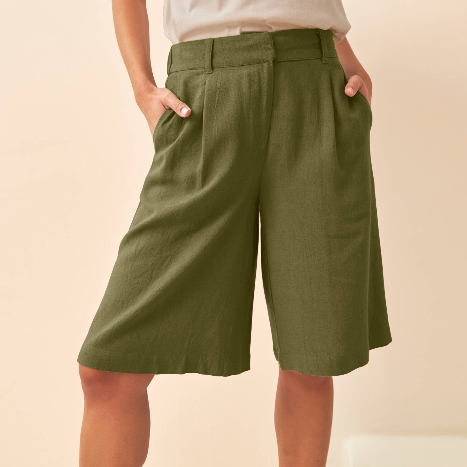 Široké bermudy s prímesou ľanu sú tým pravým letným kúskom. Široký strih. Bežná výška pása. Vpredu tvarovaný pás, vzadu pružný. Zapínanie na zips + dvojitý háčik + 1 vnútorný gombík. 2 ploché sklady vpredu. 2 klinové vrecká. 2 záševky vzadu. Možno prať v práčke.