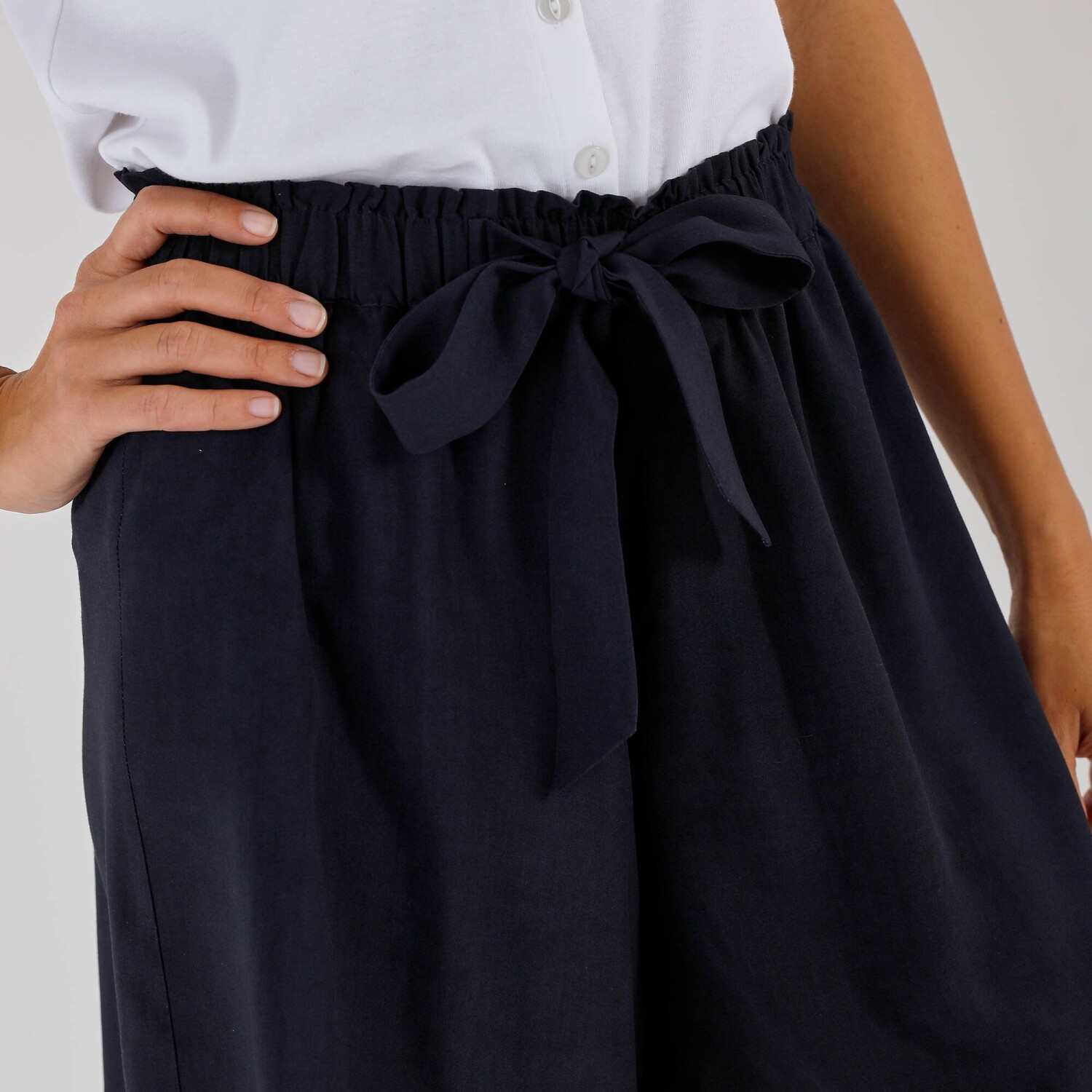 Navrhnuté z eco-friendly viskózy, s opaskom na zaviazanie, tieto šortky stavili na módny štýl a ohľaduplnosť k planéte. Bežná výška pása. Široký strih. Pružný pás. Stuha na zaviazanie vpredu. Tento produkt bol vyrobený z viskózy Lenzing EcoVero. Ekologická viskóza je materiál vyrobený z buničiny z udržateľne obhospodarovaných lesov. Výrobný proces vyžaduje menej vody a energie. Možno prať v práčke.
