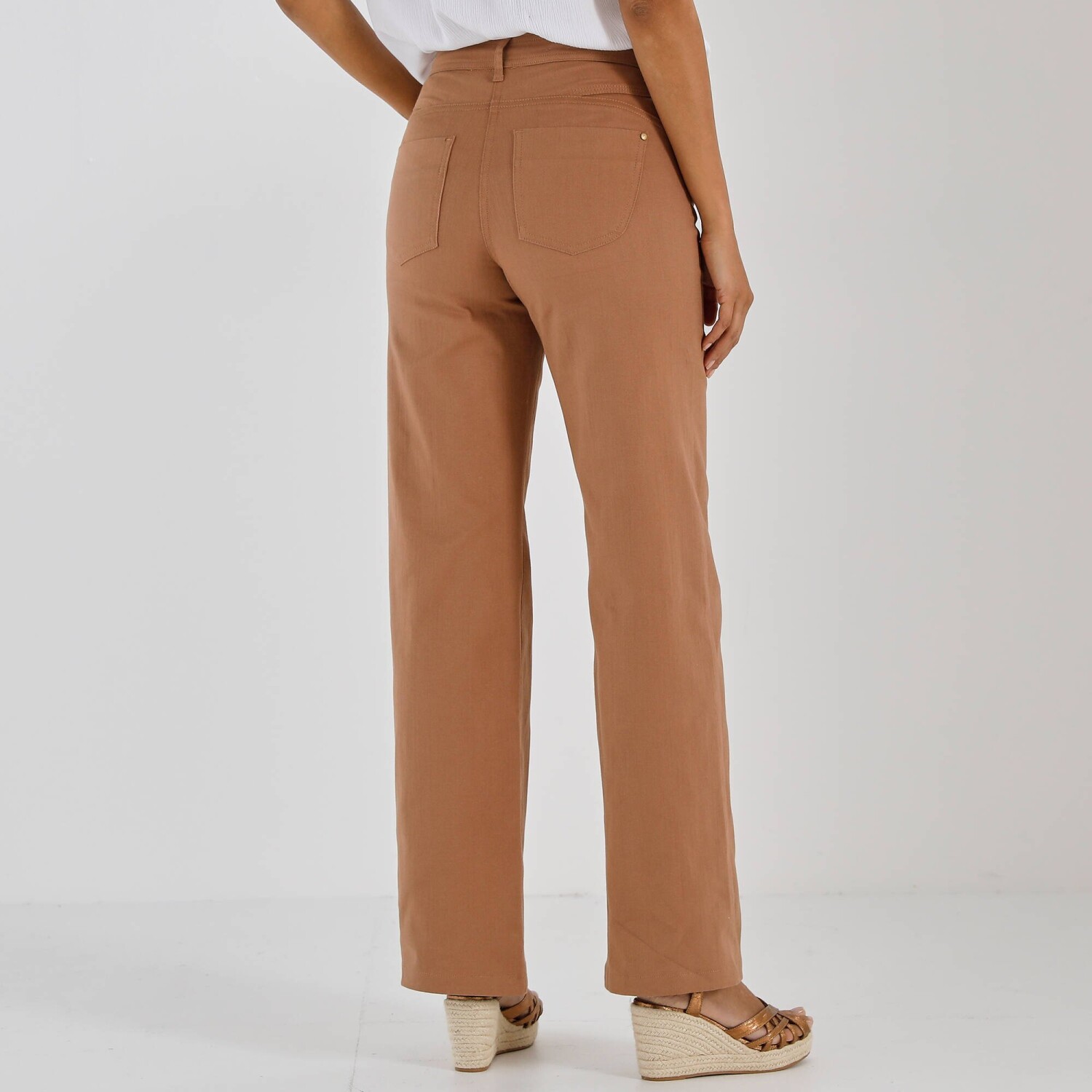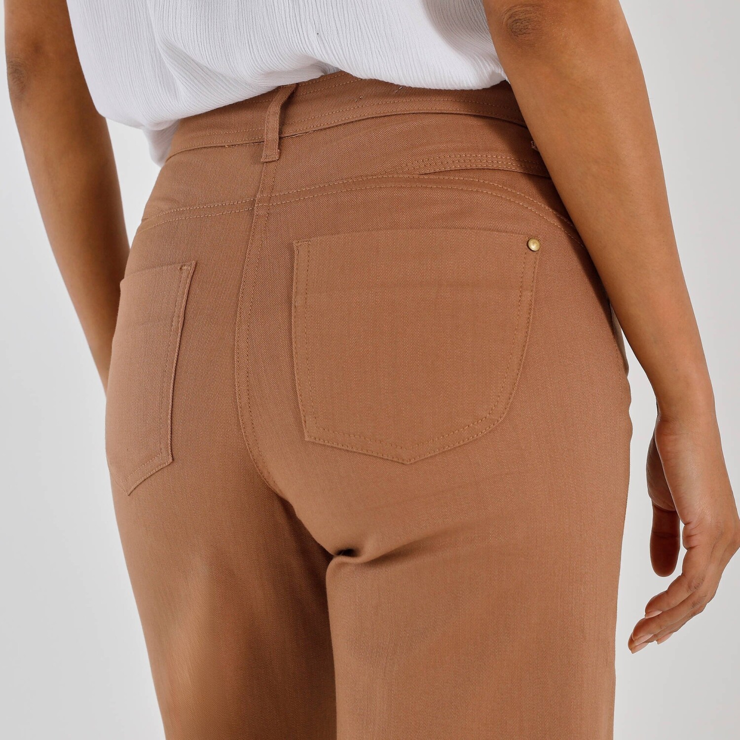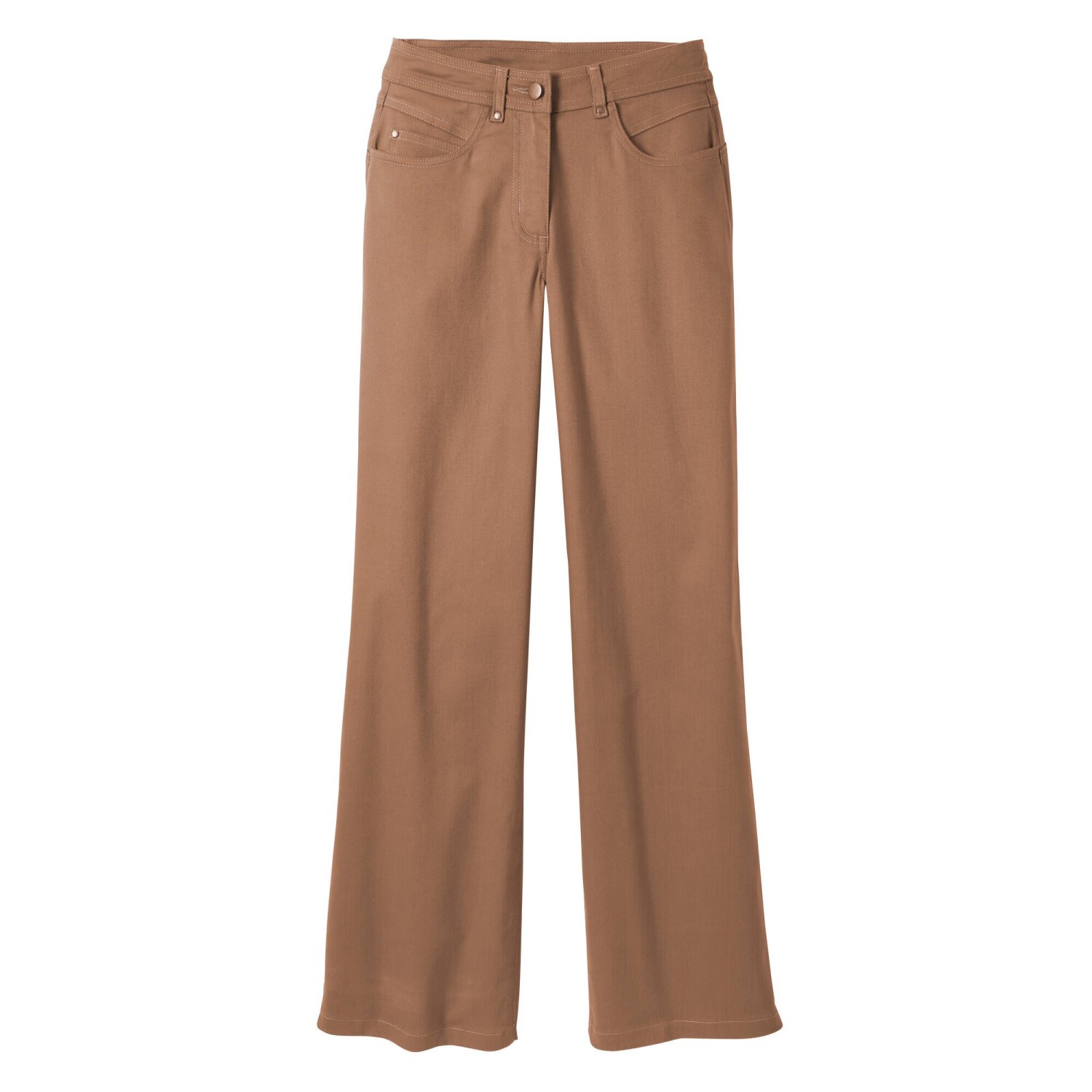 Buďte neprehliadnuteľná vo farebných širokých nohaviciach a skombinujte ich s topánkami na podpätku. Široký módny strih predlžujúci postavu. Tvarovaný pás s pútkami, zvýšený sed a kontrastné prešitie. Zapínanie na zips + 1 vrecko vpredu. 2 našité vrecká vzadu s nitmi. Standard 100 by Oeko-Tex (n° CQ 1216/3 IFTH). Táto známka označuje textilné výrobky, ktoré boli podrobené laboratórnym testom na široké spektrum škodlivých látok a výrobok je bezpečný nad rámec platných noriem. Perte s bielizňou rovnakej farby.