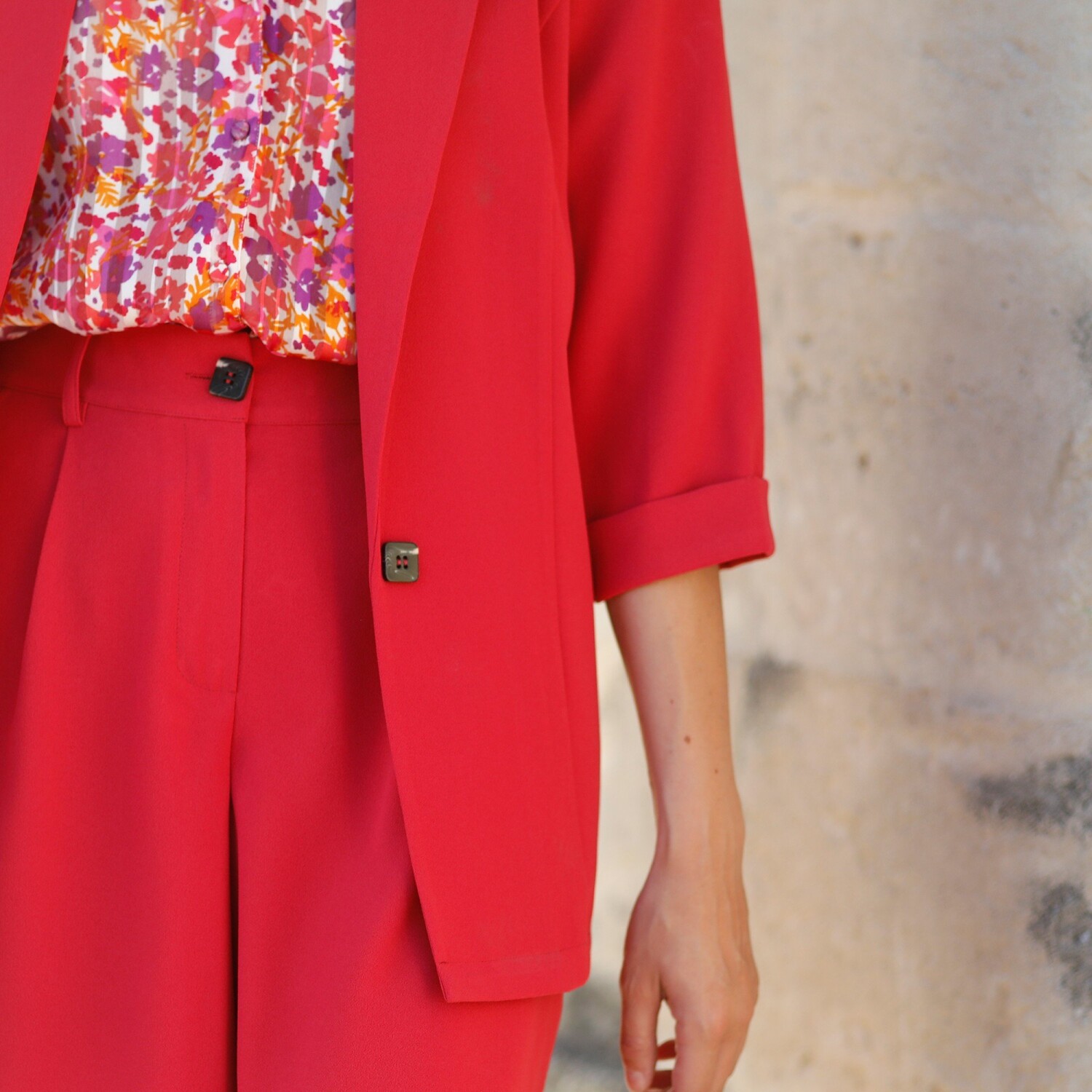 Vzdušné, štýlové a pohodlné, kostýmové sako opäť prichádza na módnu scénu. Kostýmový golier. Vpredu bez zapínania. Predný a zadný diel v princesovom strihu. 3/4 rukávy s hrnutím. Vnútri podsadené až po švy ramien. Rovný spodný lem. Možno prať v práčke.