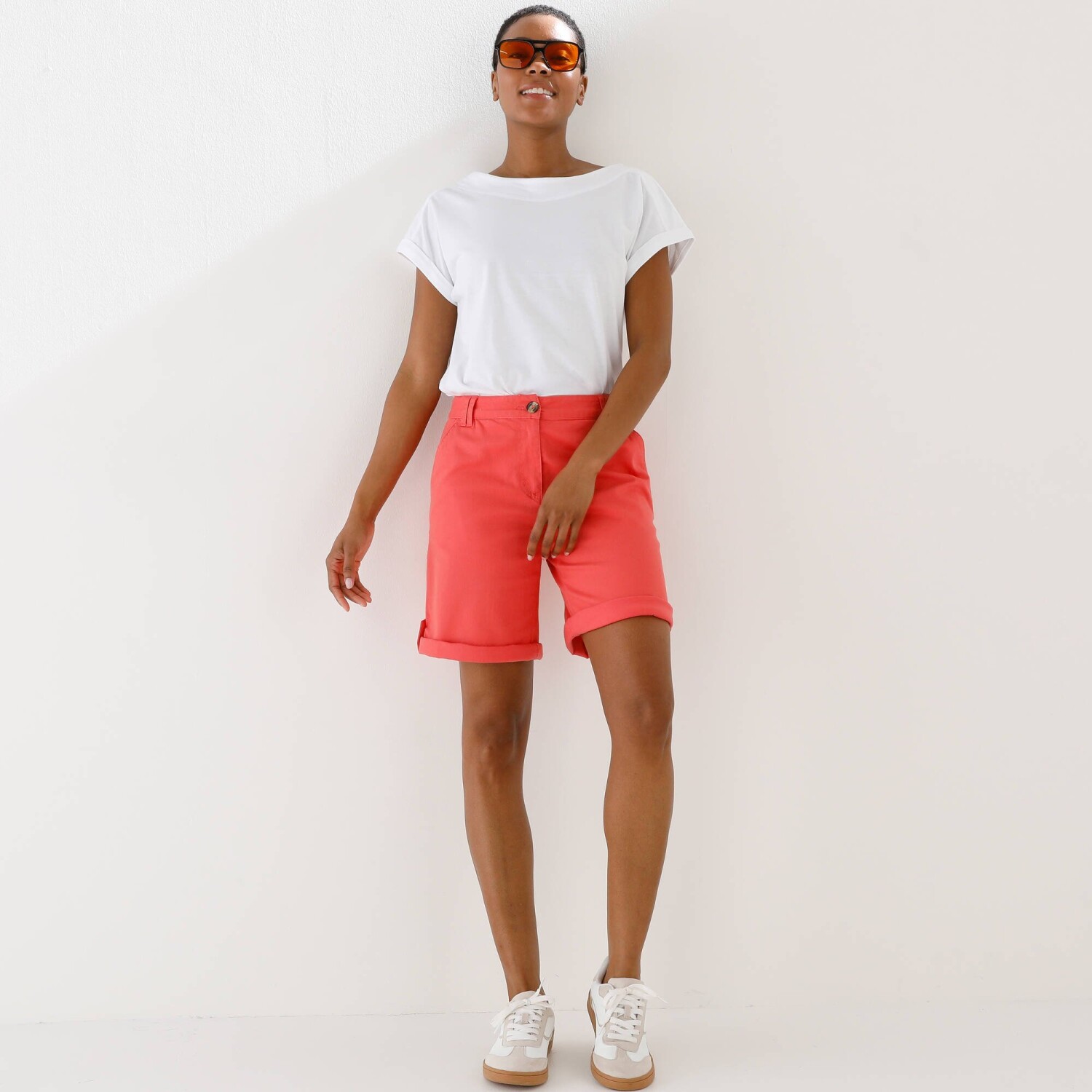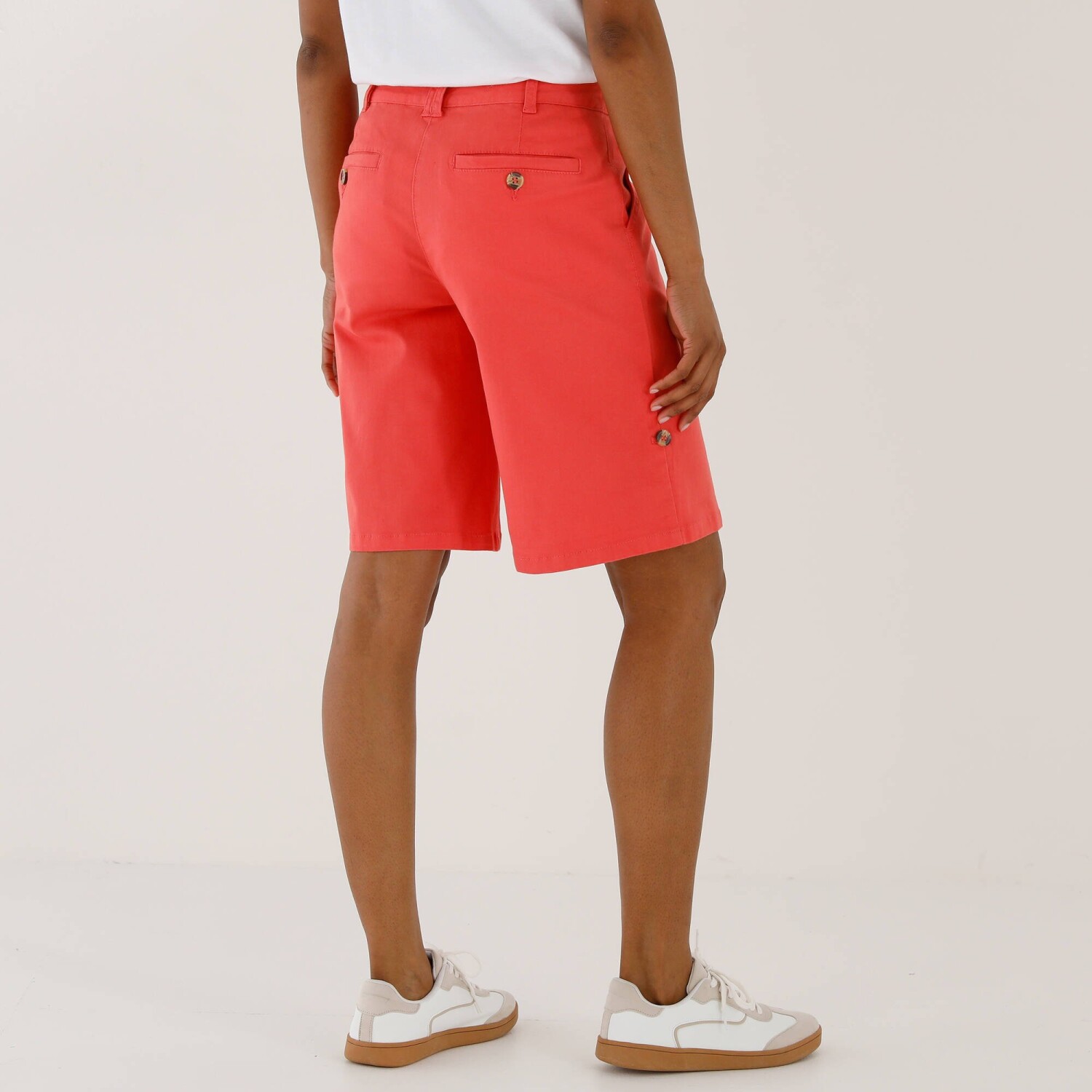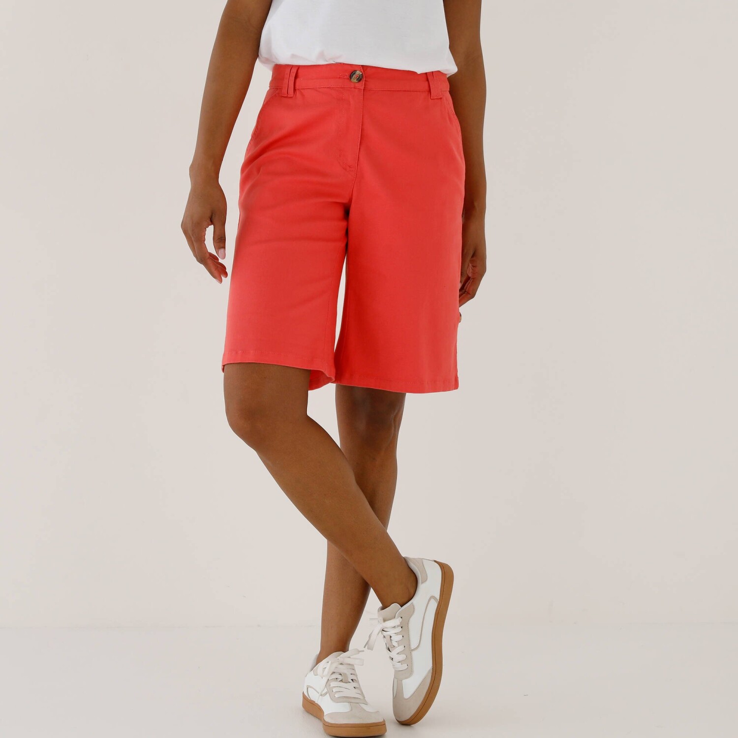 Odhaľte svoje nohy v bermudách s nastaviteľnou dĺžkou! Ušité zo strečovej bavlny hebkej na dotyk, tieto bermudy premeníte v okamihu na šortky. Zapínanie na zips + gombík. Bežná výška pása. Tvarovaný pás s pútkami, vzadu na bokoch pružný od veľkosti 44. 2 klinové vrecká. 2 vrecká s paspulou na gombík + 2 záševky vzadu. Konce nohavíc ohrnuté pomocou gombíkového pútka. Standard 100 by Oeko-Tex (n° CQ 1216 / 3 IFTH) označuje textilné výrobky, ktoré boli podrobené laboratórnym testom na široké spektrum škodlivých látok a výrobok je bezpečný nad rámec platných noriem. Možno prať v práčke.