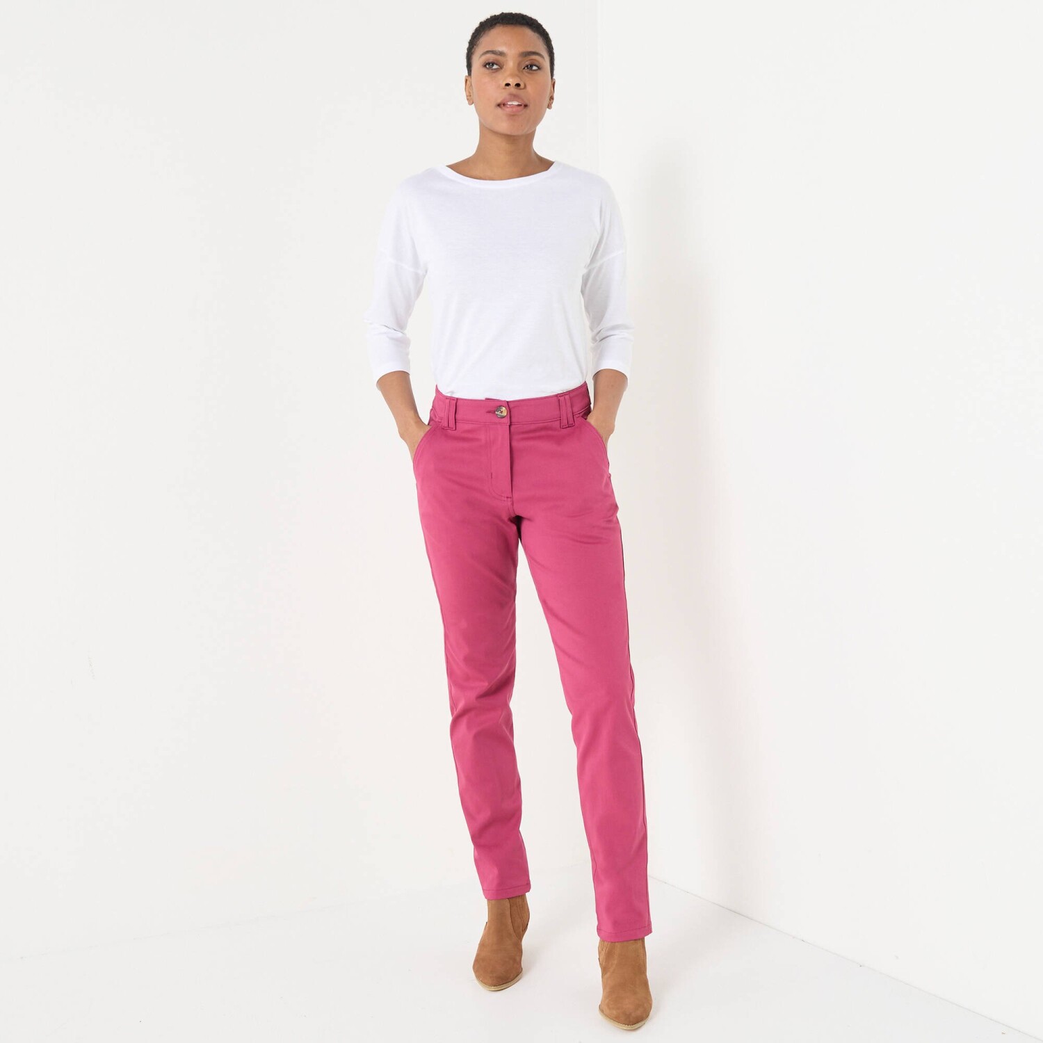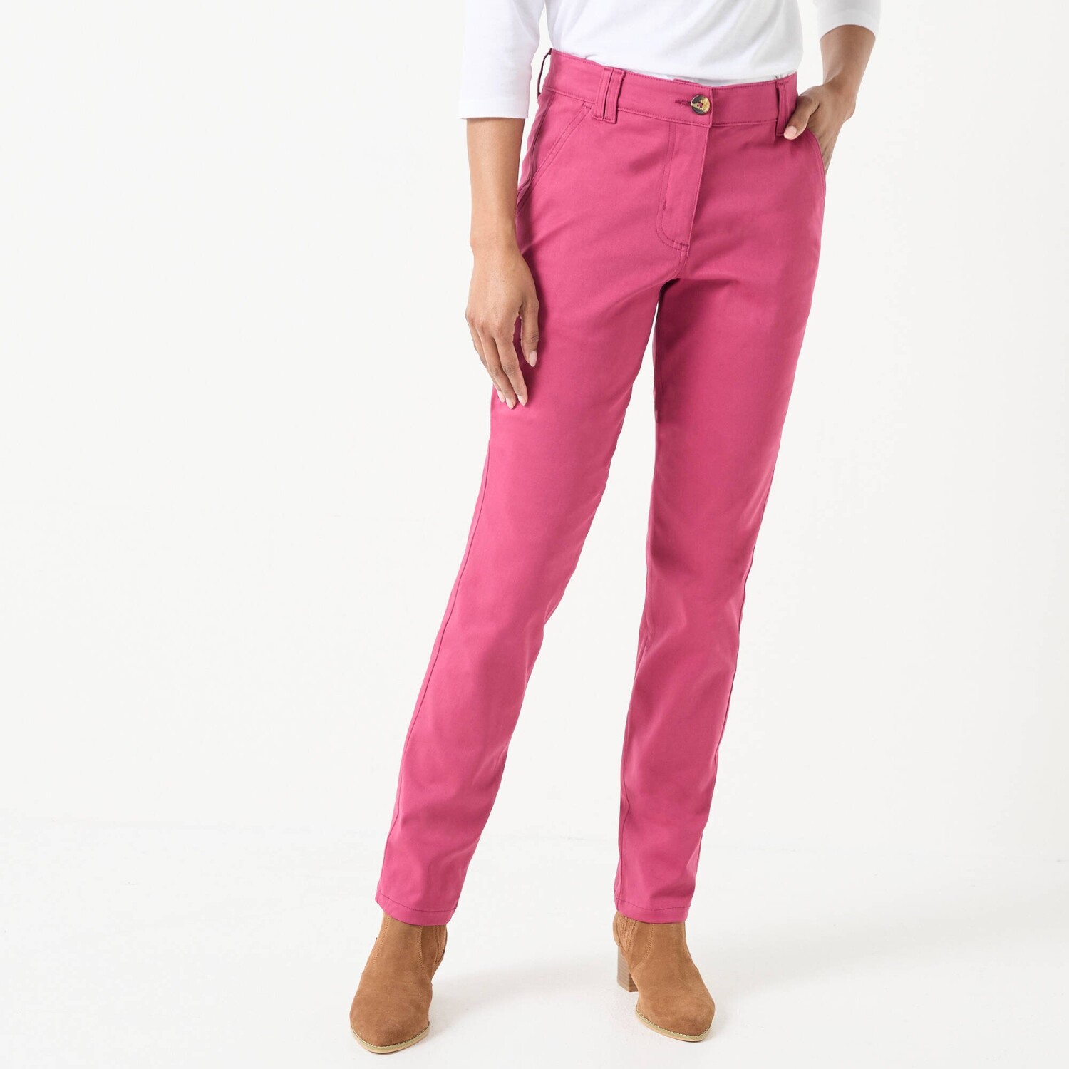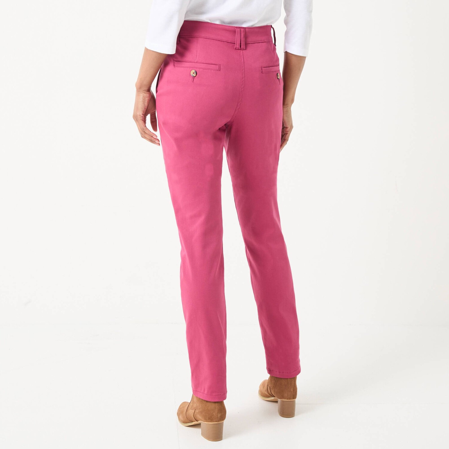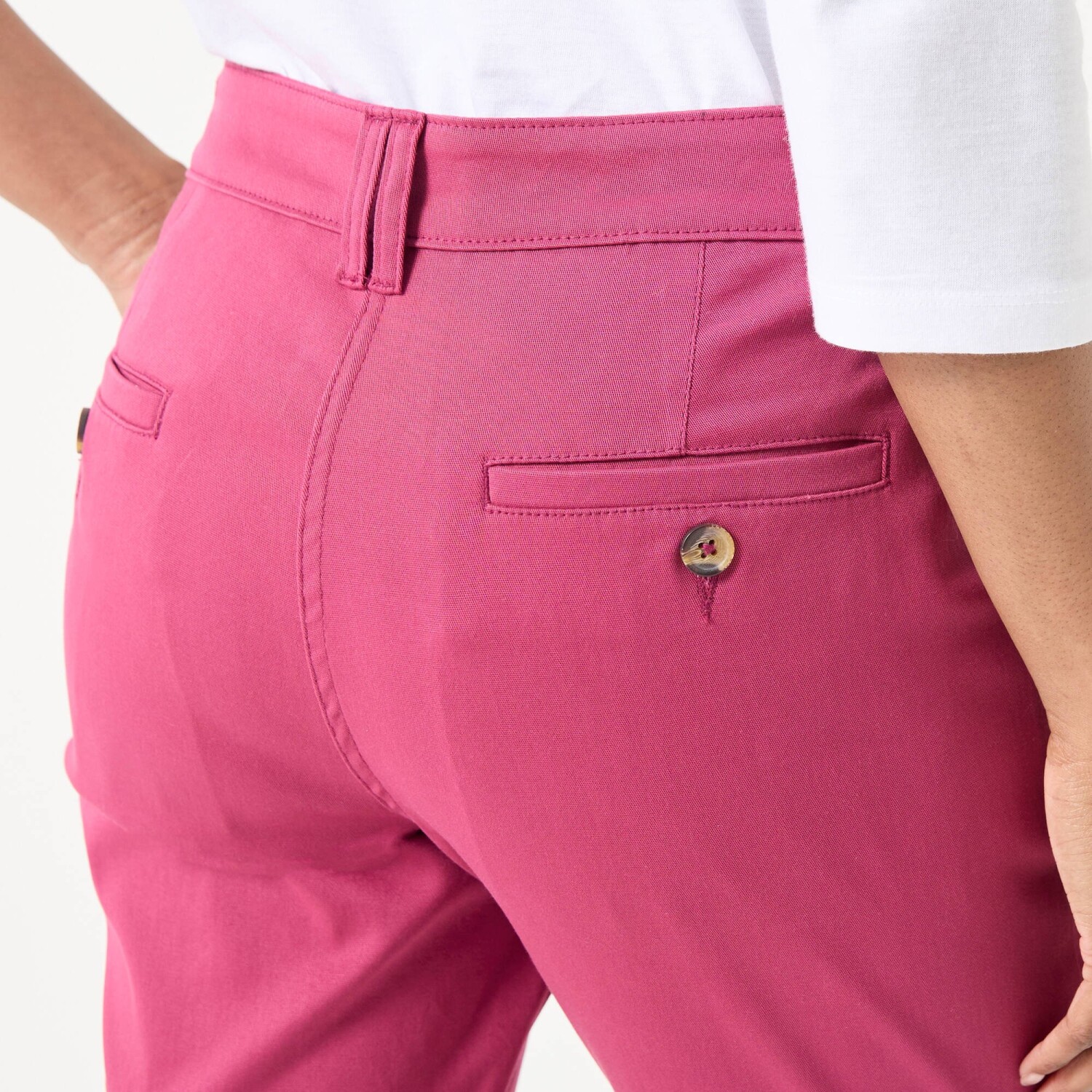 Veľmi módne nohavice v chino strihu možno ohrnúť podľa potreby. Nohavice majú bežnú výšku pása. Pás s pútkami, na bokoch pružný od veľkosti 44. Zapínanie na zips + gombík. Vpredu 2 klinové vrecká. Vzadu 2 záševky a 2 vrecká s paspulou na gombík. Standard 100 by Oeko-Tex (n° CQ 1216/3 IFTH). Táto známka označuje textilné výrobky, ktoré boli podrobené laboratórnym testom na široké spektrum škodlivých látok a výrobok je bezpečný nad rámec platných noriem. Možno prať v práčke.