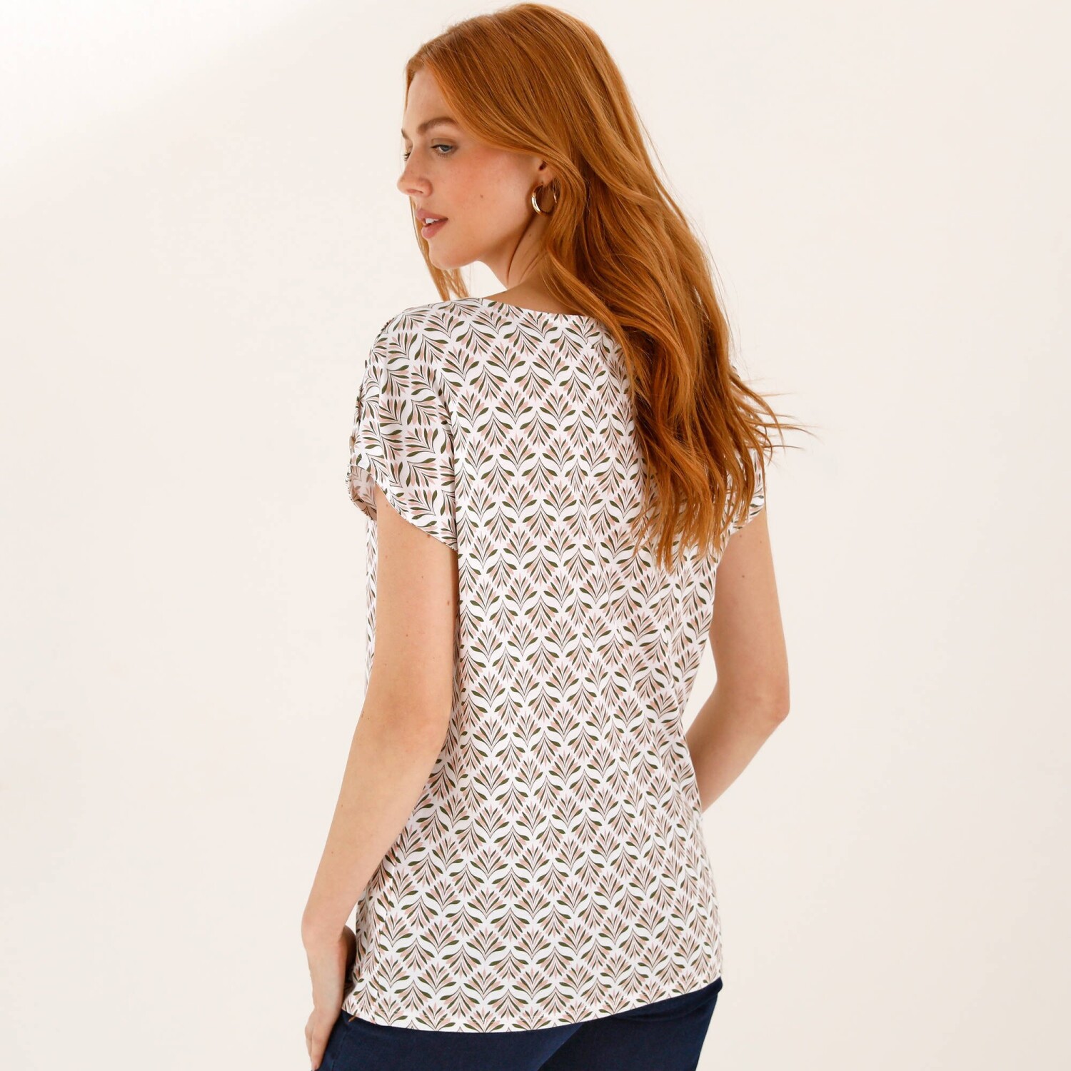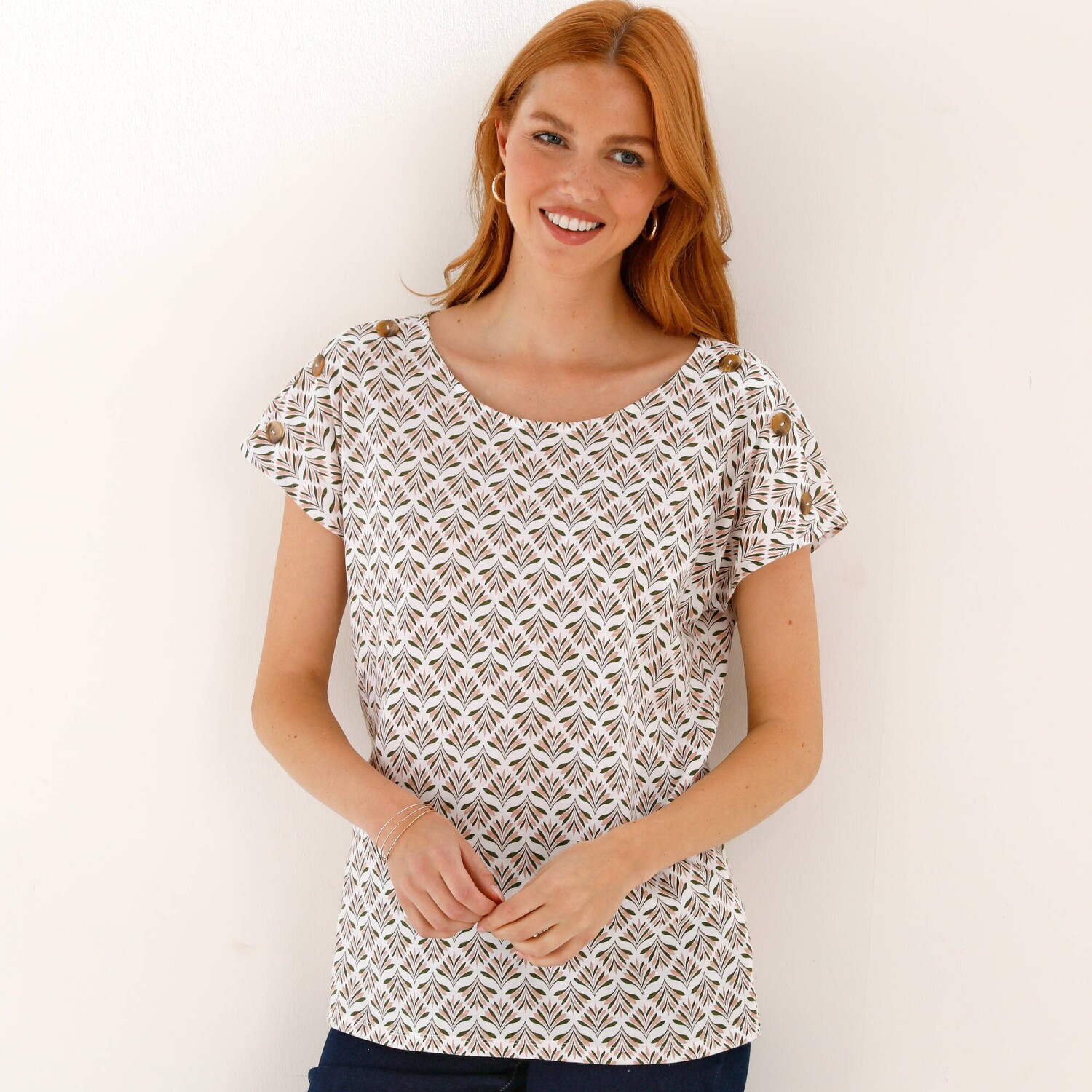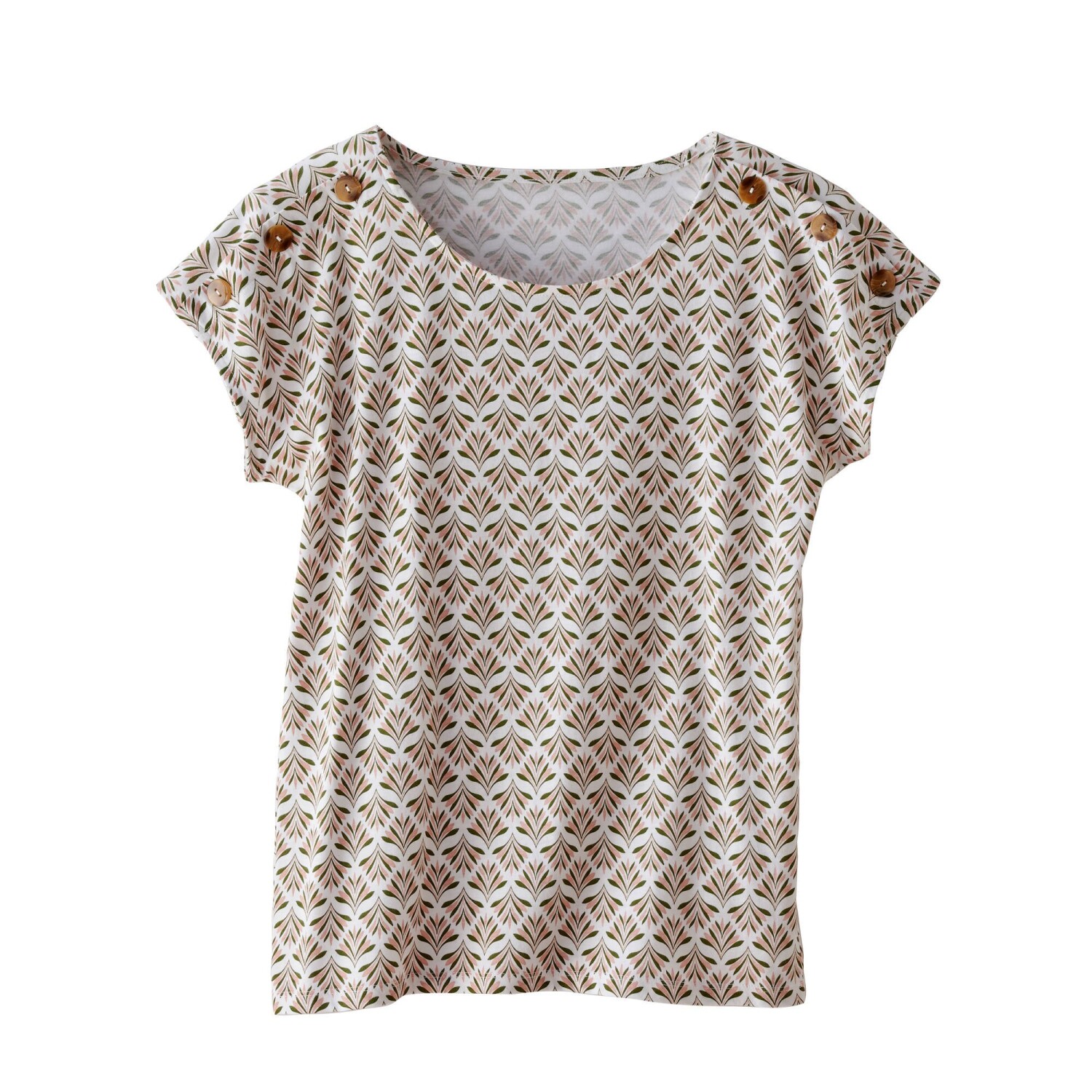 Dodajte farebnosť svojmu outfitu tričkom s originálnou drobnou potlačou. Zo vzdušného džerseja. Okrúhly výstrih. Voľné plecia. Na pleciach sklady a gombíky s efektom rohoviny. Rovný dolný lem. Standard 100 by Oeko-Tex (n° CQ 1216 / 3 IFTH). Táto známka označuje textilné výrobky, ktoré boli podrobené laboratórnym testom na široké spektrum škodlivých látok a výrobok je bezpečný nad rámec platných noriem. Možno prať v práčke.