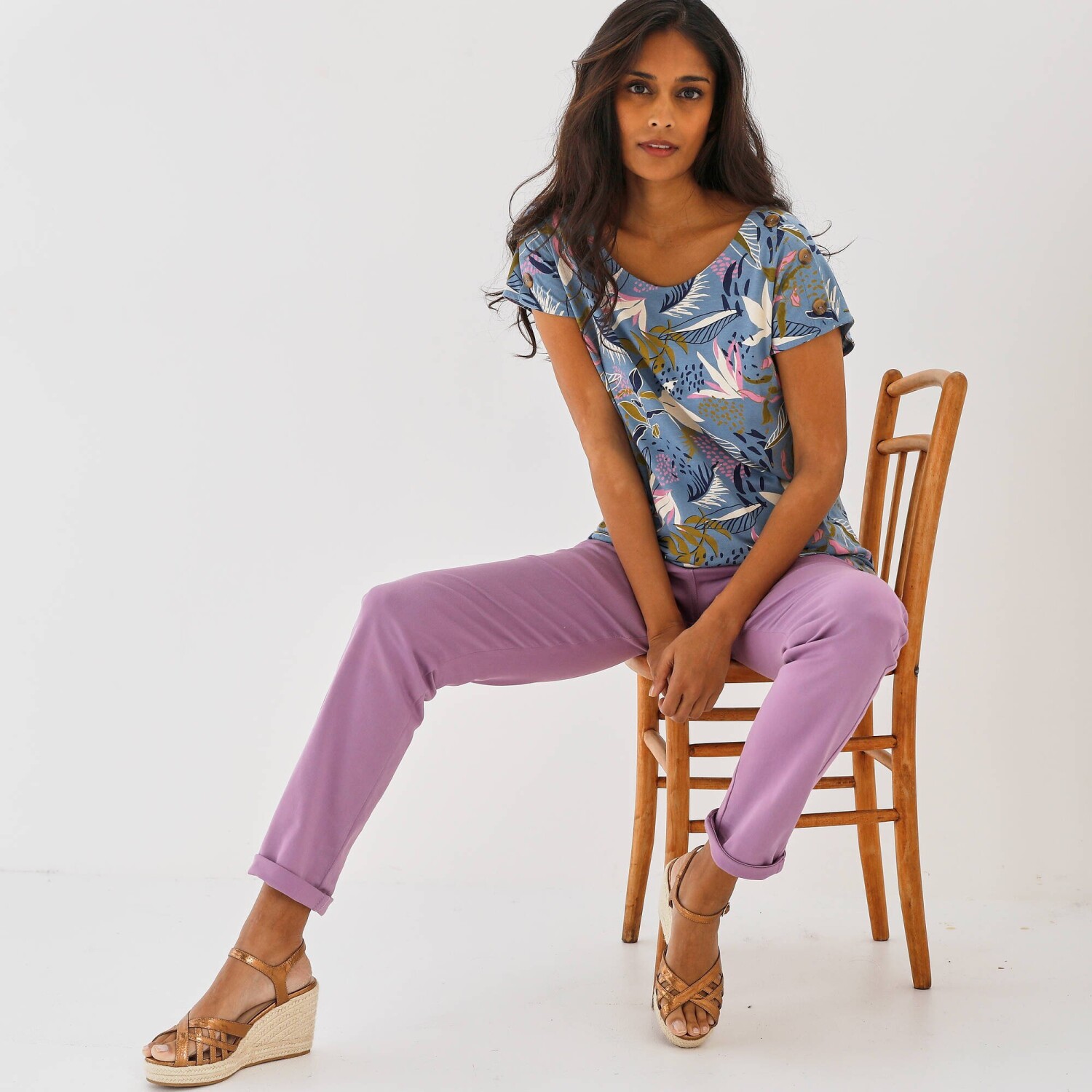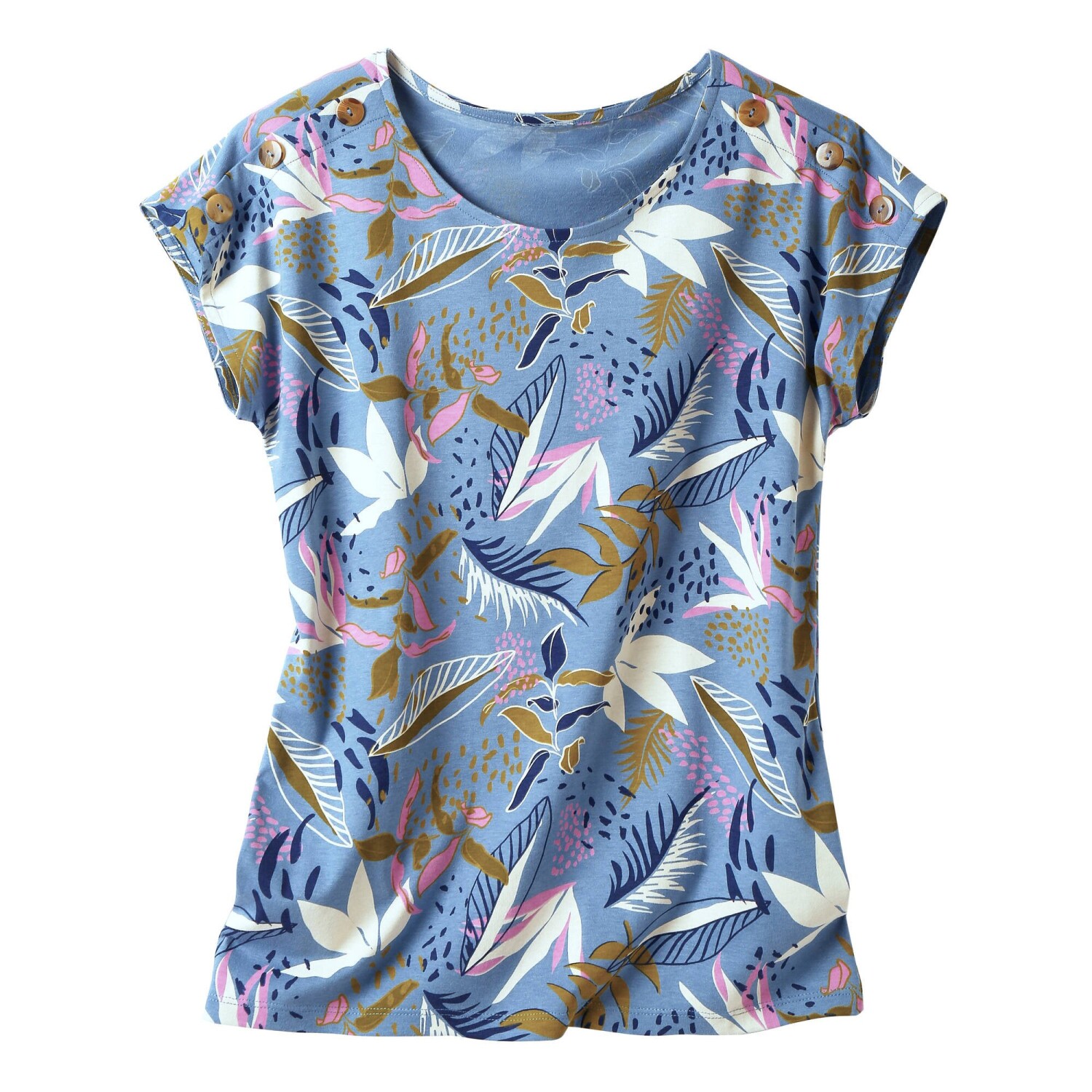 Dodajte farby Vášmu šatníku pomocou trička s tropickým vzorom. Zo vzdušného džerseja s jednoduchou údržbou. Okrúhly výstrih. Krátke rukávy. Na voľných plecich sklady a gombíky so vzhľadom rohoviny. Okrúhly výstrih. Rovný spodný lem. Standard 100 by Oeko-Tex (n° CQ 1216/3 IFTH). Táto známka označuje textilné výrobky, ktoré boli podrobené laboratórnym testom na široké spektrum škodlivých látok a výrobok je bezpečný nad rámec platných noriem. Možno prať na 30 °C.