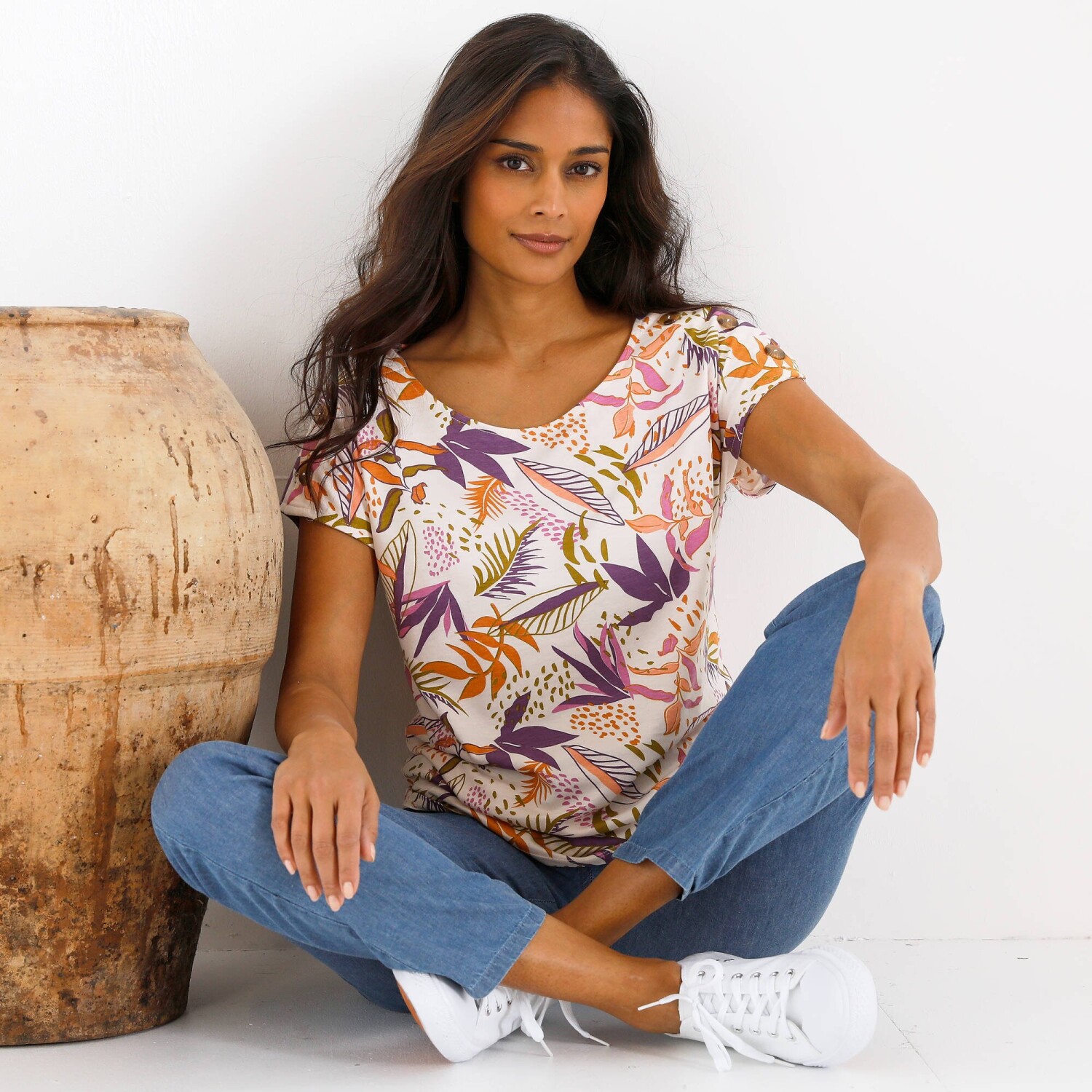 Rovné tričko s okrúhlym výstrihom a potlačou art pruhov