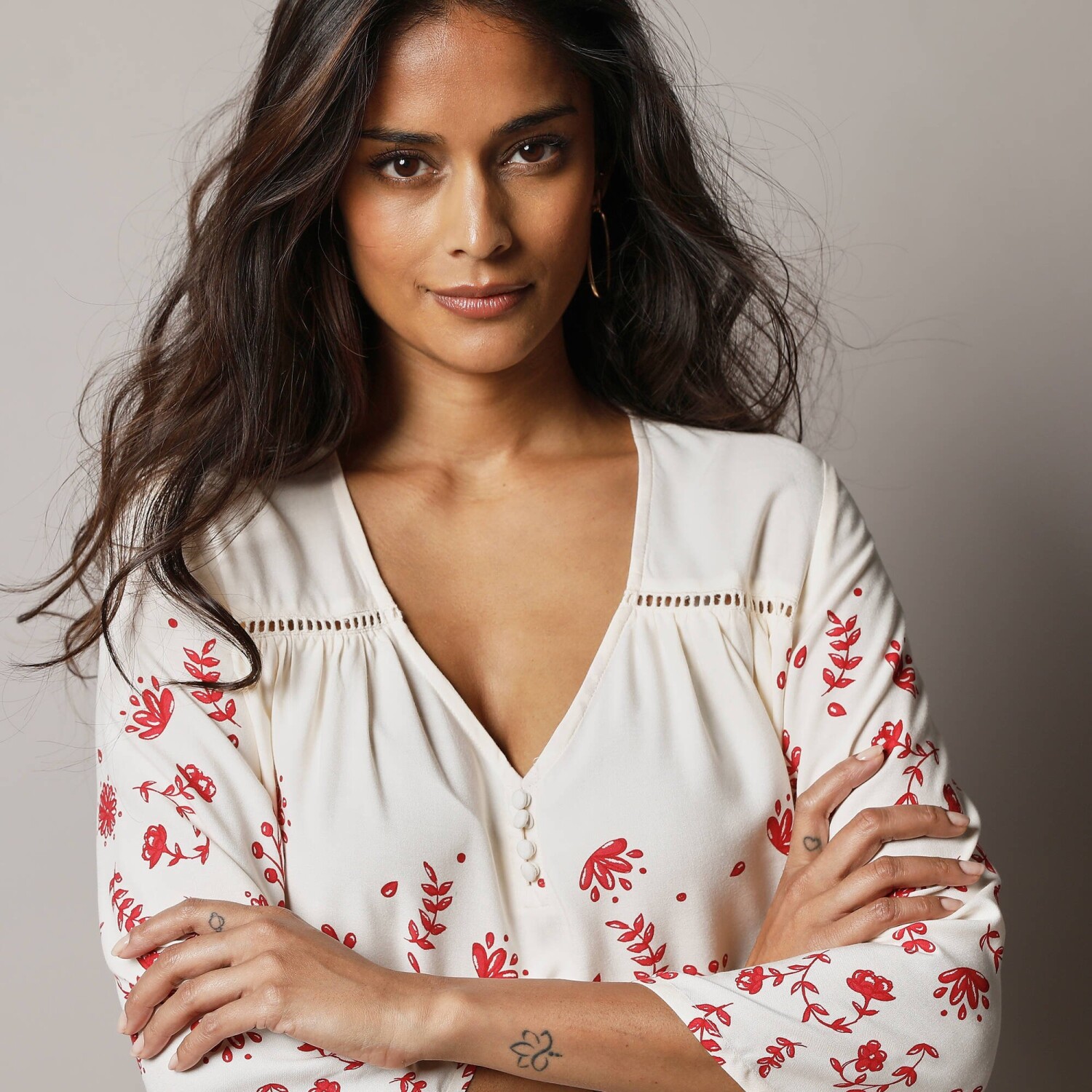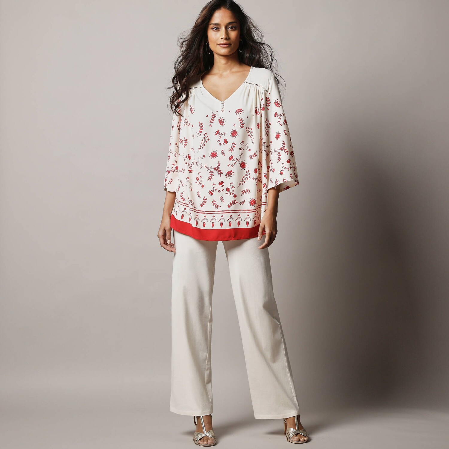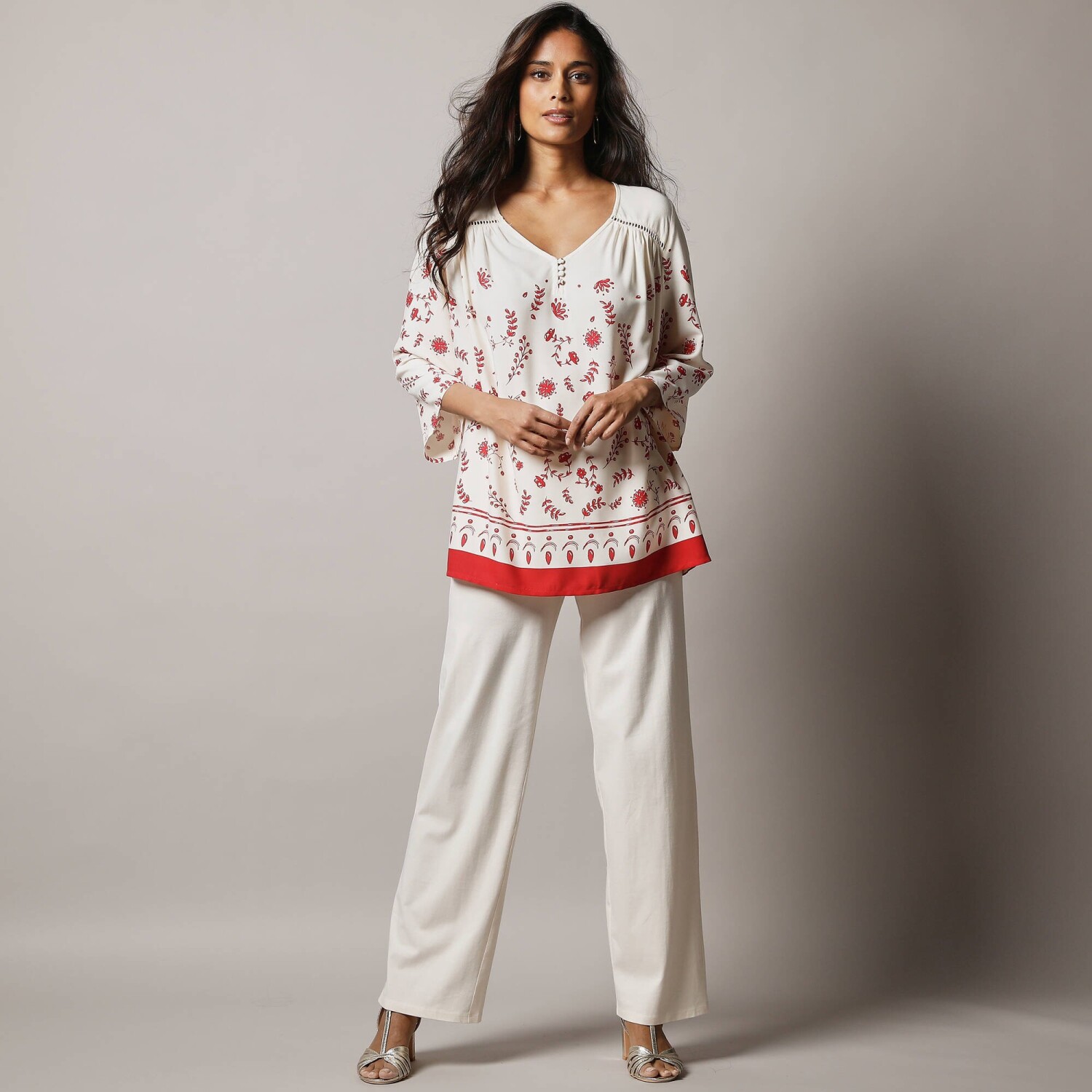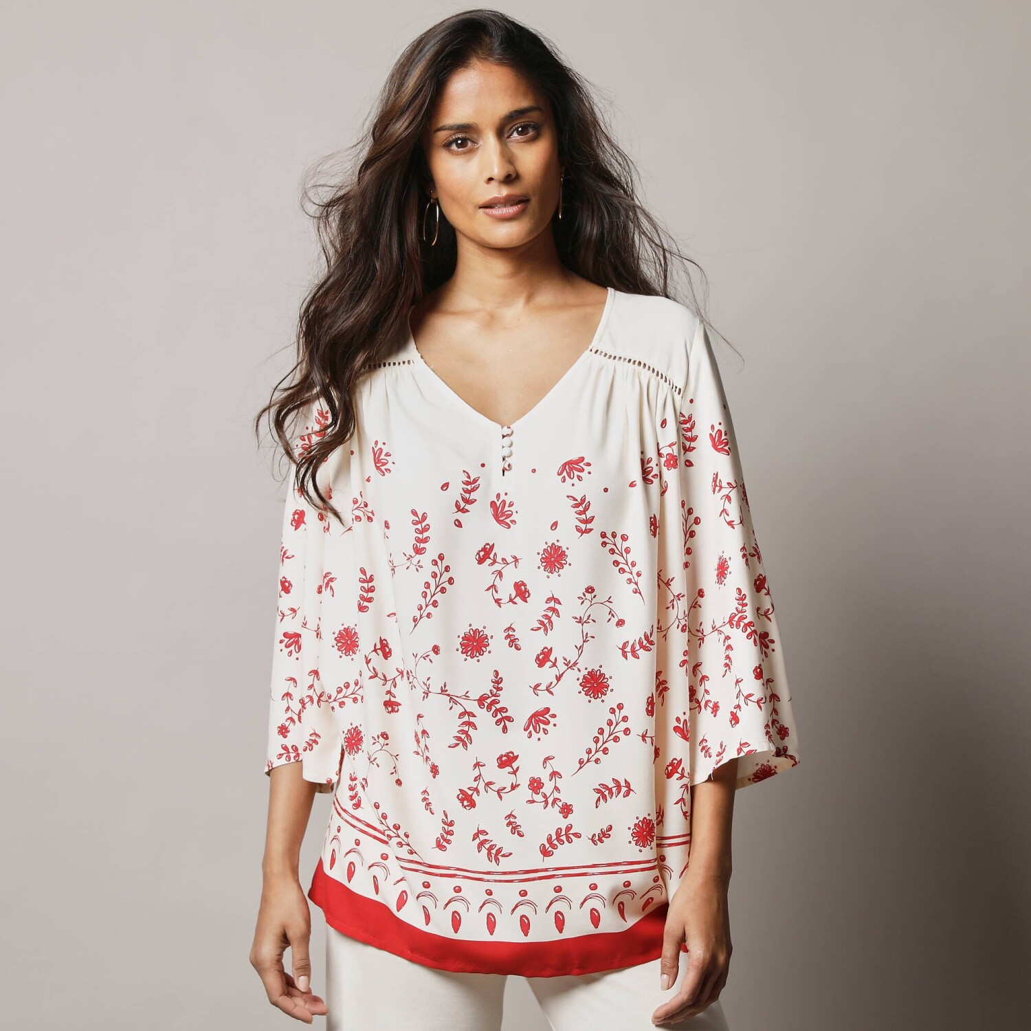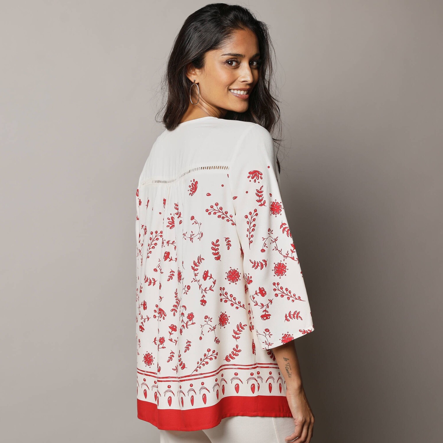 Voľný strih, háčkované zdobenie, gombíky vo výstrihu - tunika s potlačou oplýva ženskými detailmi. Vzdušný príjemný úplet. Výstrih do "V" s prestrihom na gombíky. Vpredu a vzadu sedlo s nariasením a háčkovaním. 3/4 pagodové rukávy. Rovný rozšírený dolný lem. Možno prať v práčke.