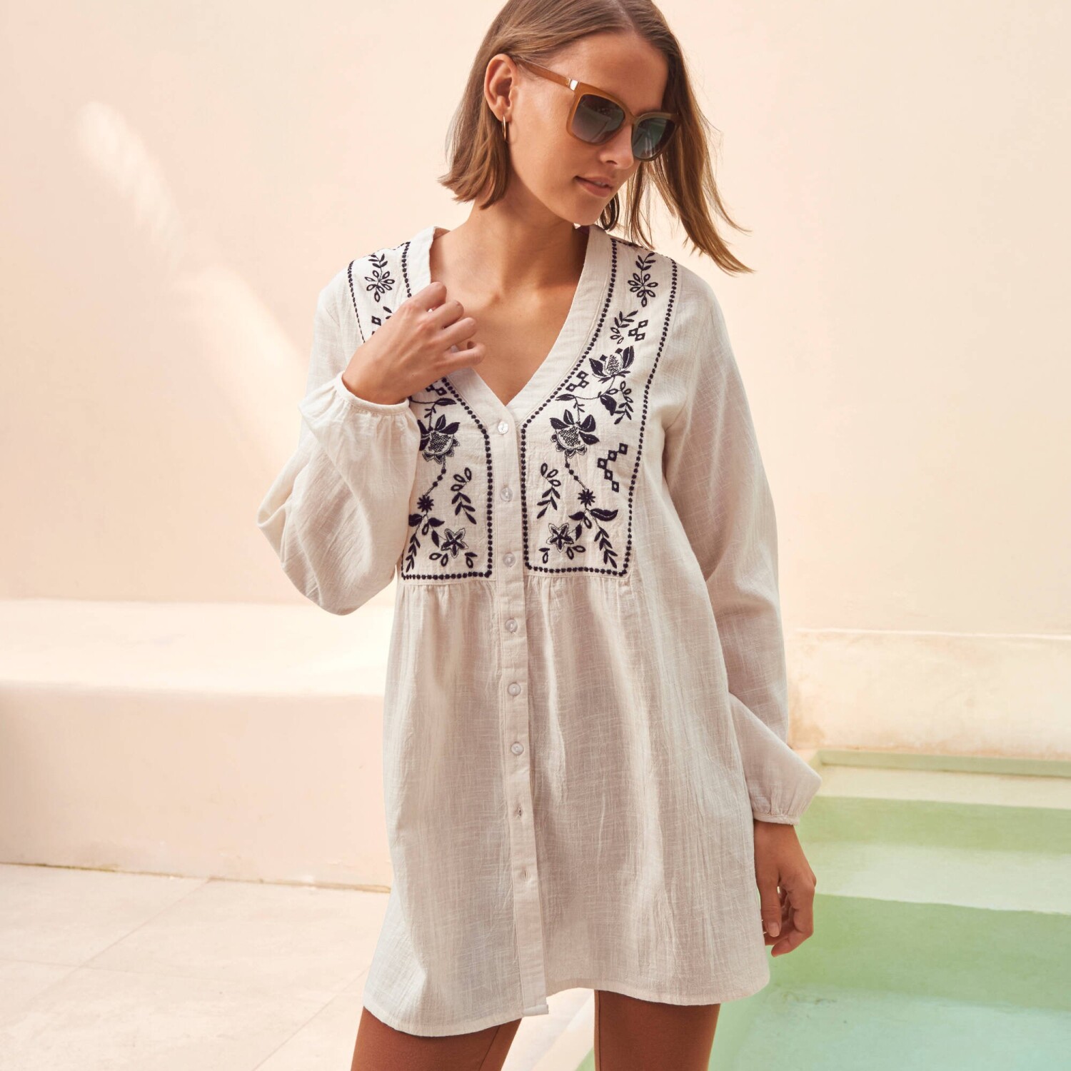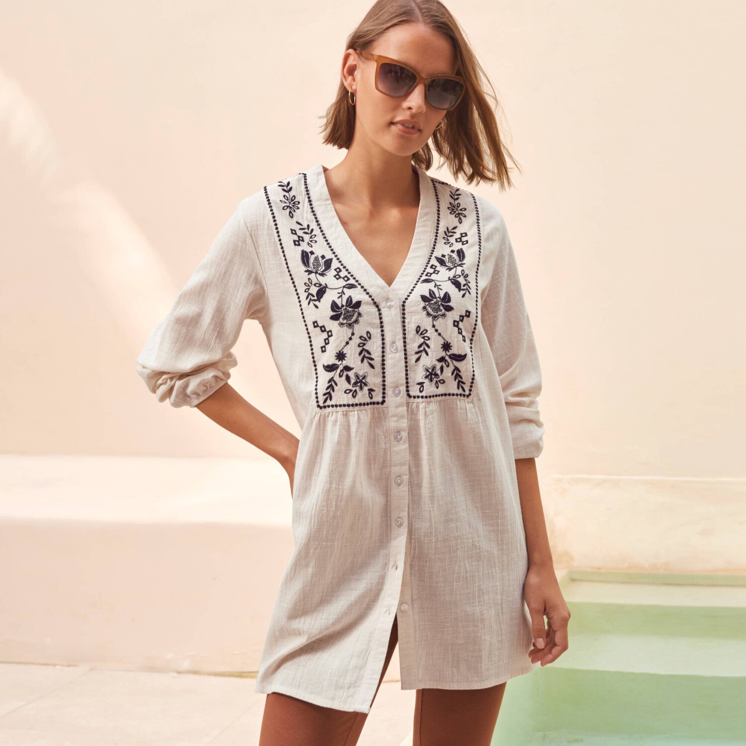 Kontrastná výšivka a textúrovaný povrch - folkový štýl si podmanil módnu scénu a my Vám tak prinášame túto módnu tuniku! Výstrih do "V" s gombíkovou légou. Vpredu vyšívaná náprsenka s nariasením. Ramená s členitým strihom. Dlhé rukávy. Úzke manžety. Vzadu v strede pod výstrihom nariasenie. Možno prať v práčke.