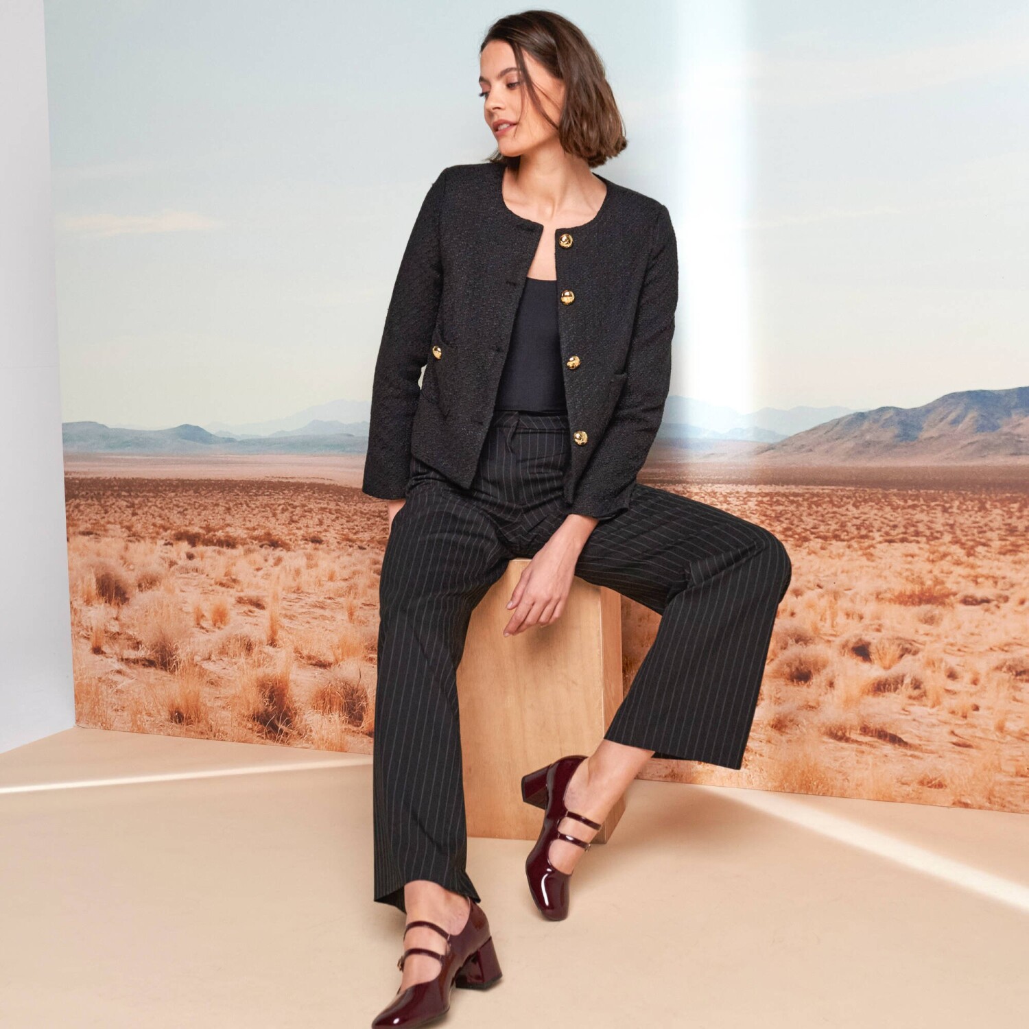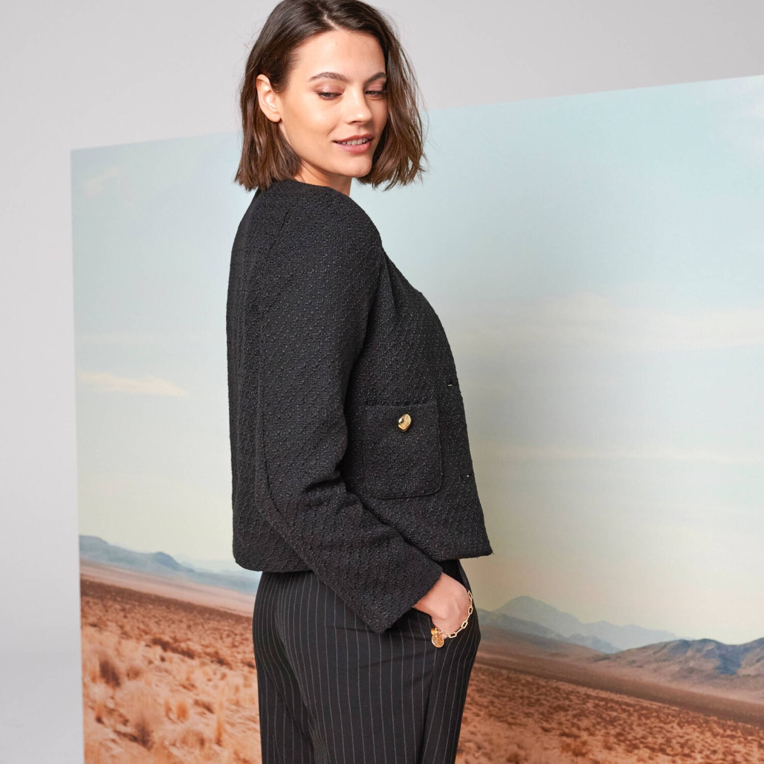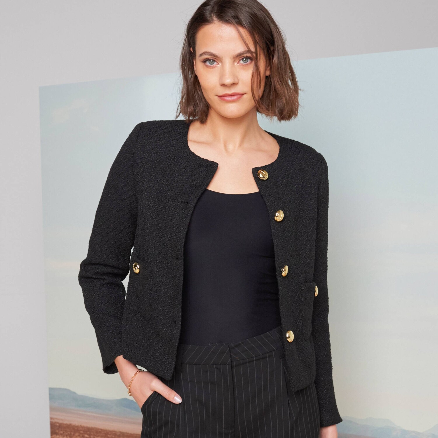 Módne sako by nemalo chýbať v žiadnom šatníku. Rovný strih. Skrátená dĺžka. Okrúhly výstrih. Gombíky zlatej farby. 2 našité vrecká s 1 gombíkom vpredu. Výplne pliec. Dlhé rukávy. Celopodšívka. Rovný spodný lem. Možno prať v práčke.