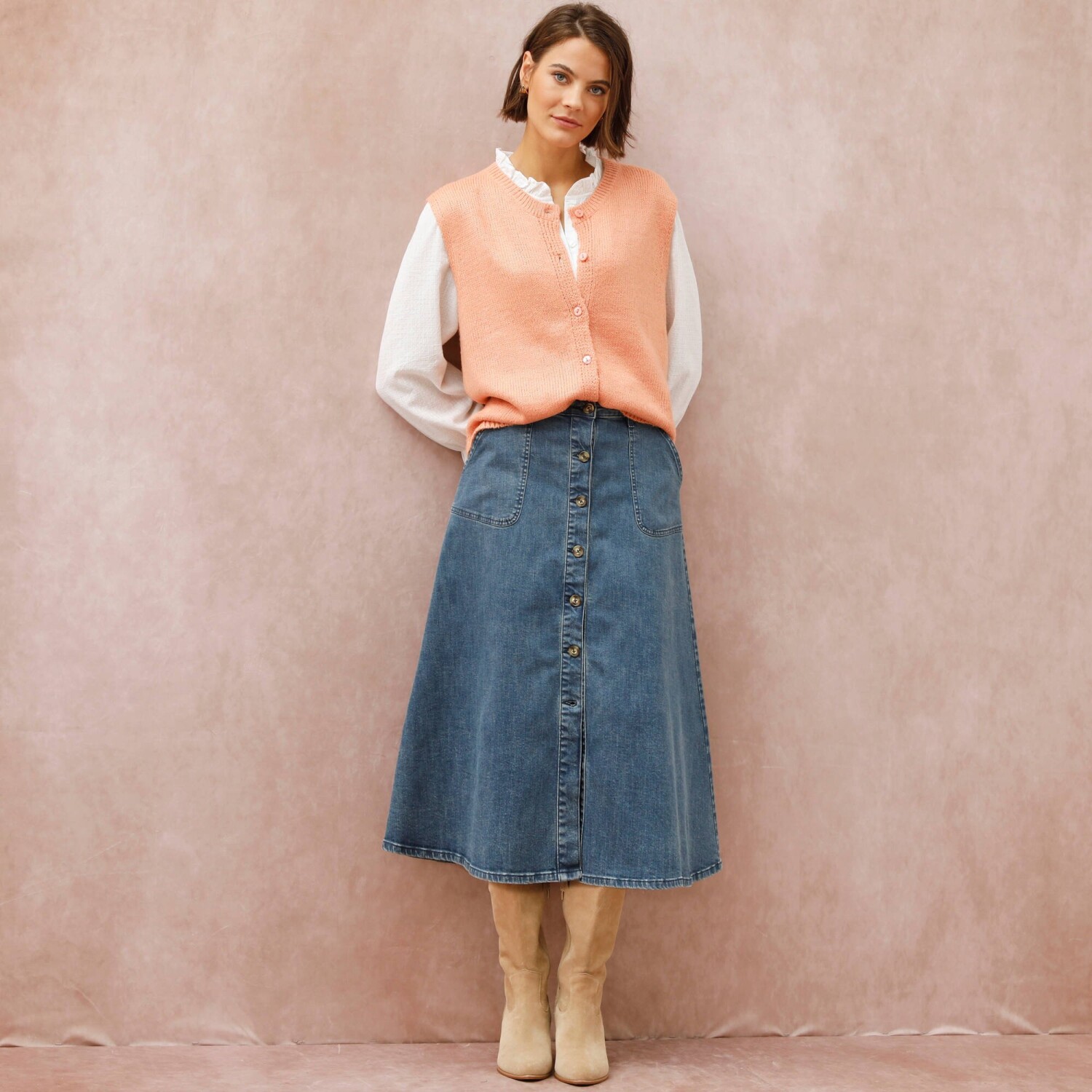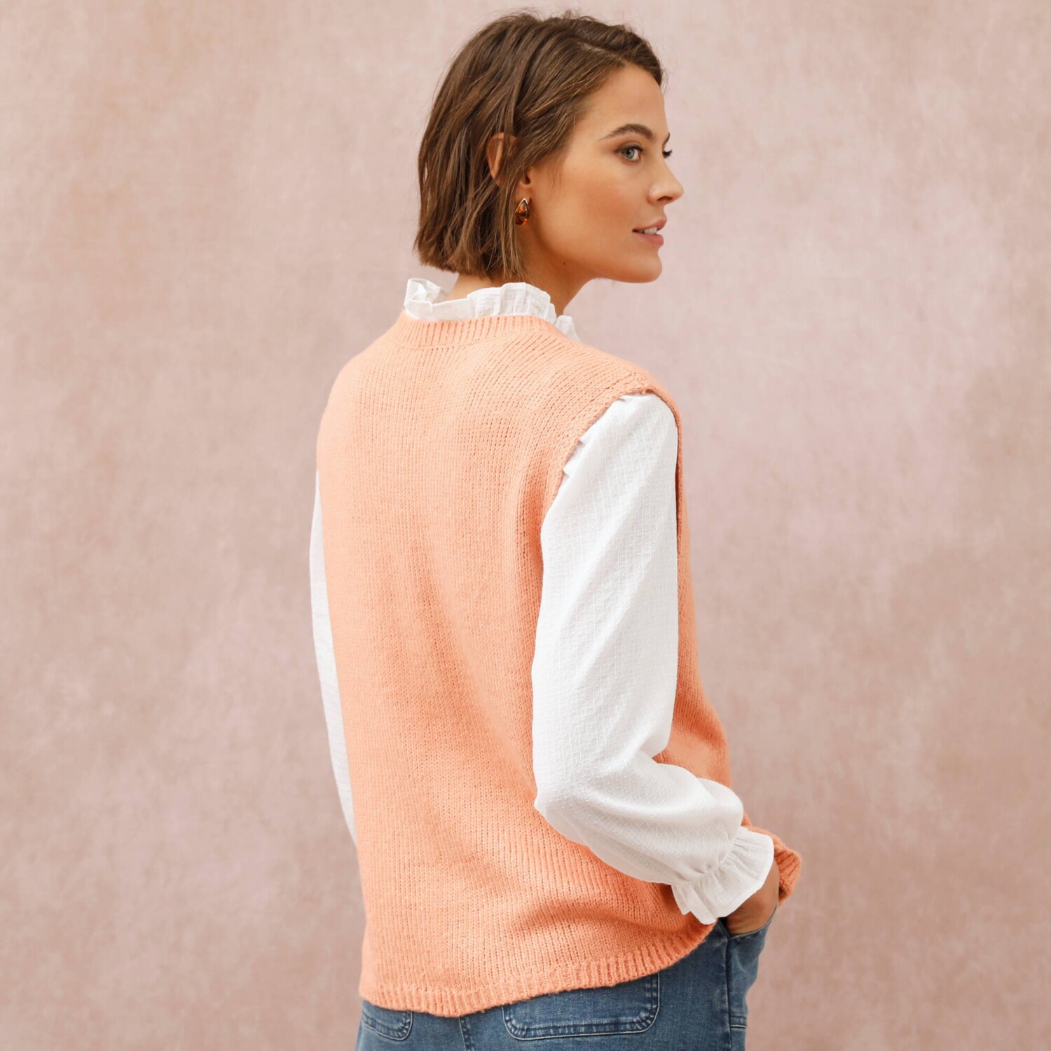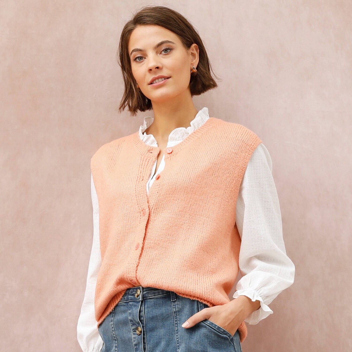 Prihlásenie RegistrovaťElegantná vesta na zapínanie príjemne zahreje a navyše oživí celý outfit. Voľný padnúci strih. Okrúhly vrúbkovaný výstrih. Široké prieramky. Gombíková léga s perleťovým efektom. Rovný, vrúbkovaný dolný lem. Možno prať v práčke.