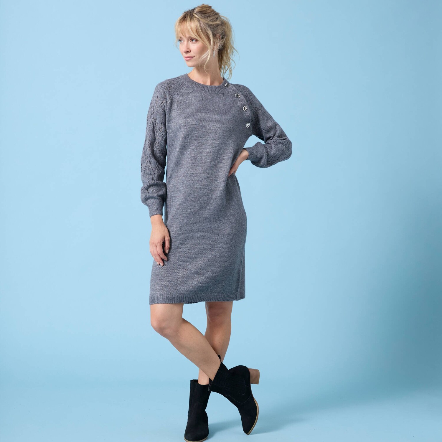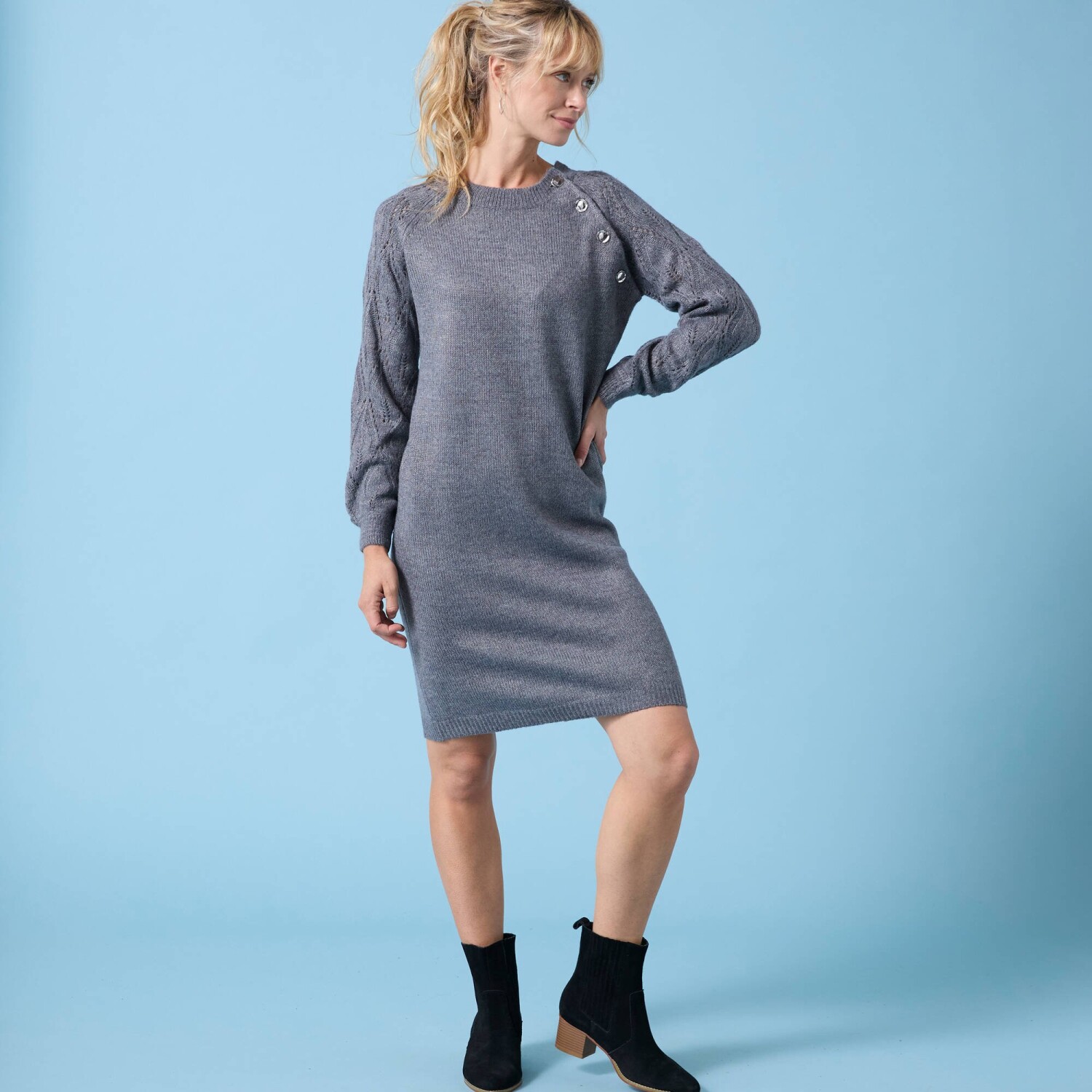 Úpletové šaty navrhnuté pre nižšiu postavu ponúkajú všetok šarm jemného úpletu a ažúrových detailov! Nosí sa priamo na telo av kombinácii s čižmami vytvorí glamour look aj v zimnom počasí. Jemné na dotyk. Okrúhly výstrih. Raglánové prieramky. Dlhé nazberané rukávy s ažúrovým vzorom. Na ľavom prieramku gombíky. Rovný spodný lem. Možno prať v práčke.