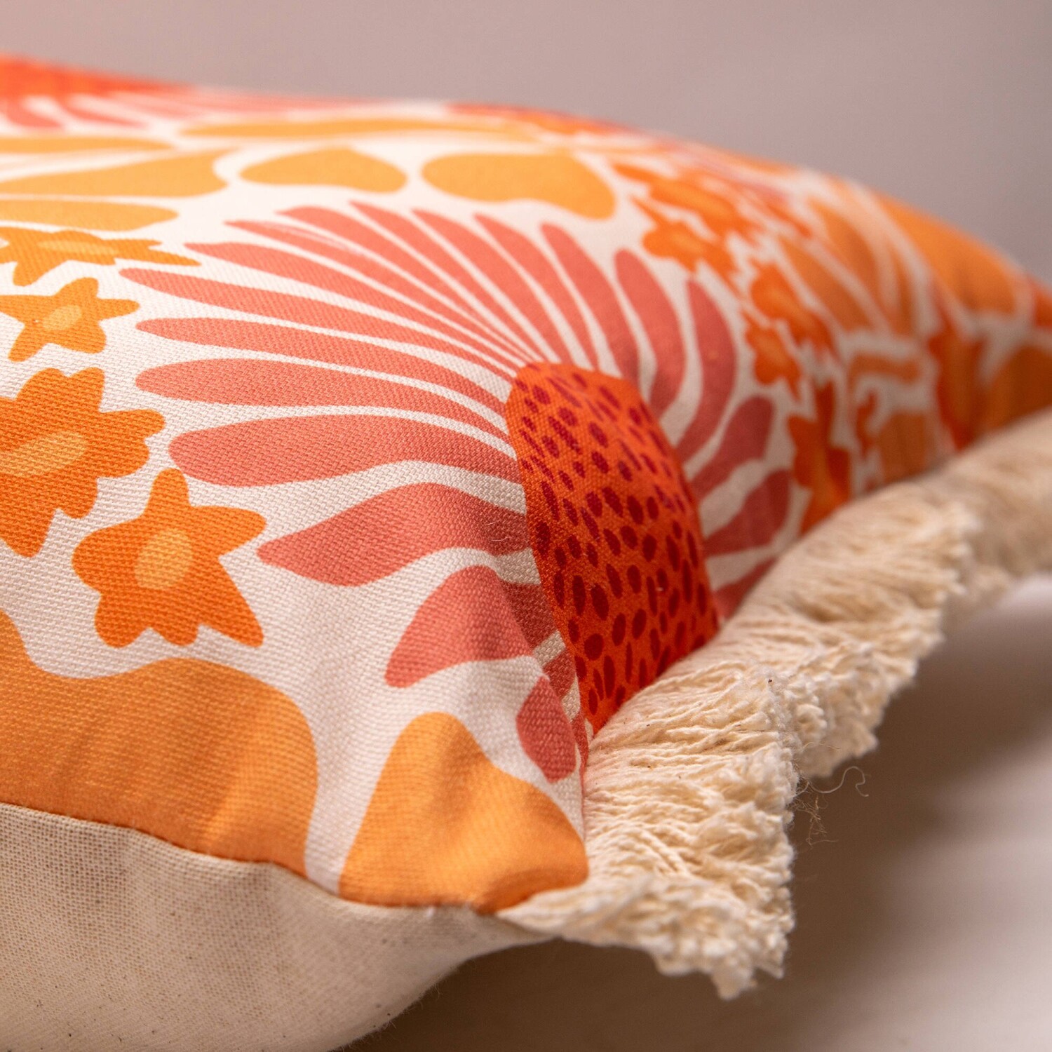 Trúfnite si na farby a originálny dizajn s týmto krásnym vankúšom. 1, strana s farebným vzorom kvetov. 2. stranajednofarebná, v prírodnom tóne. Na bokoch strapce. Na zips, povlak je možné stiahnuť a vyprať.