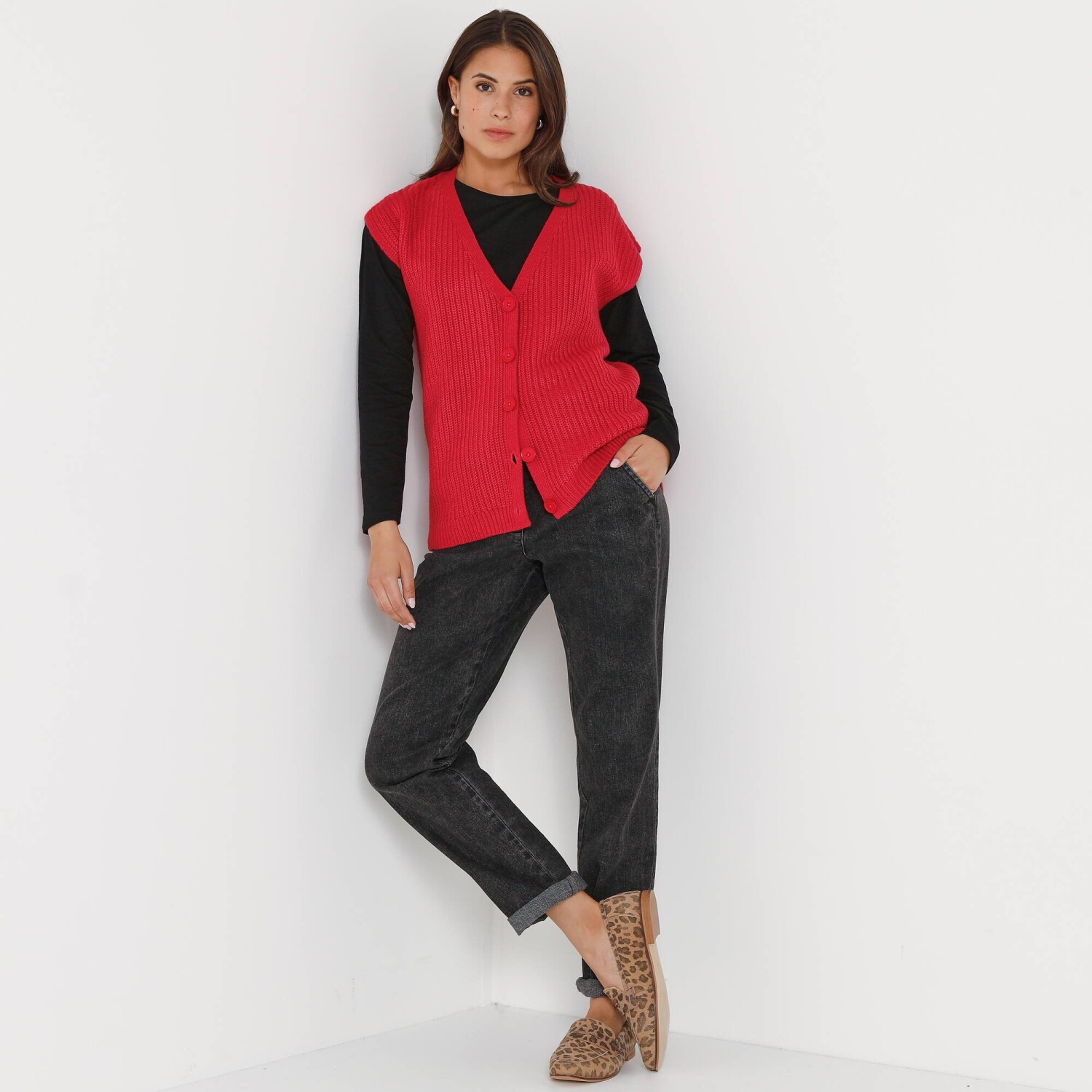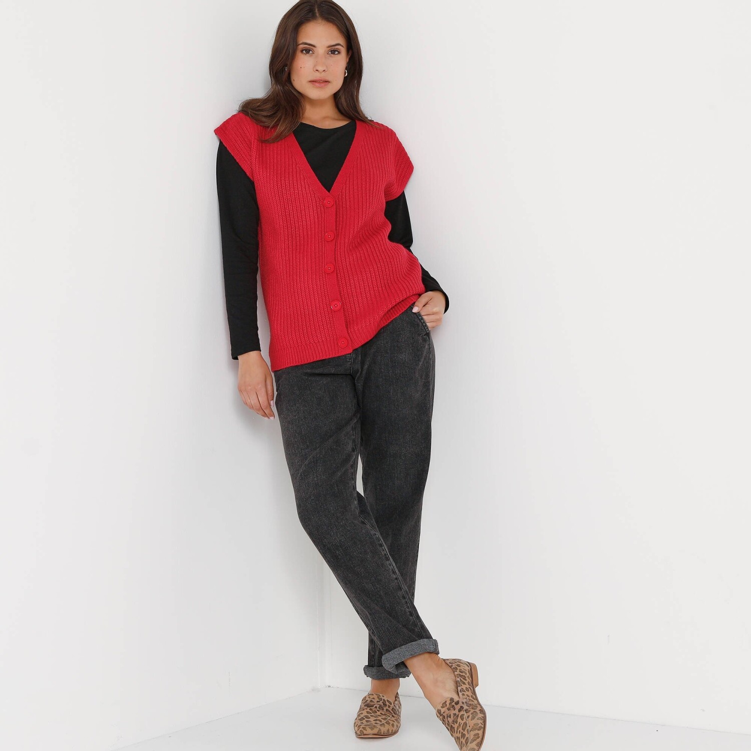 Skvelá na každú príležitosť, to je naša obľúbená zapínacia vesta. Mäkký úplet s hladkým vzorom. Hrejivý úplet. Hlboký výstrih do V. Gombíková léga. Vrúbkované zakončenie. Rovný spodný lem. Možno prať v práčke.