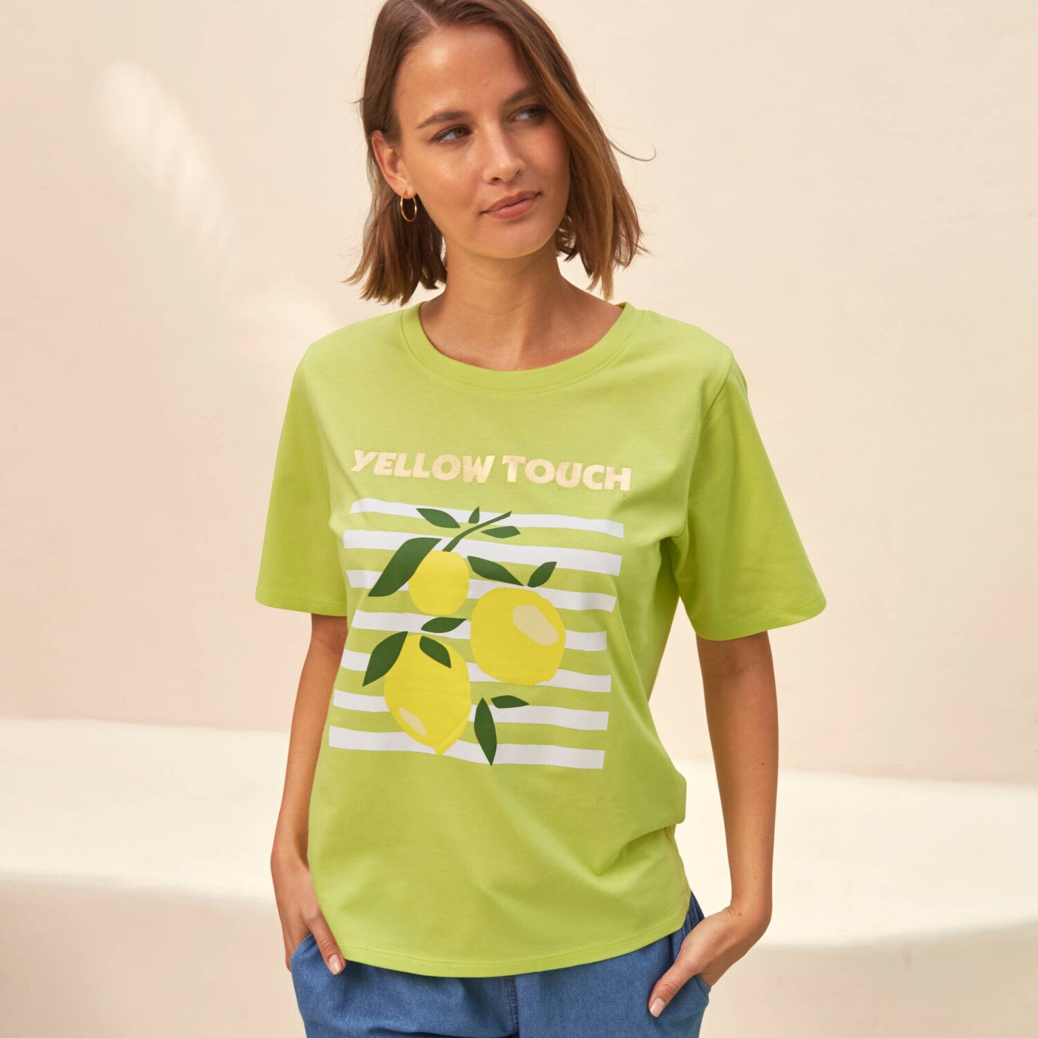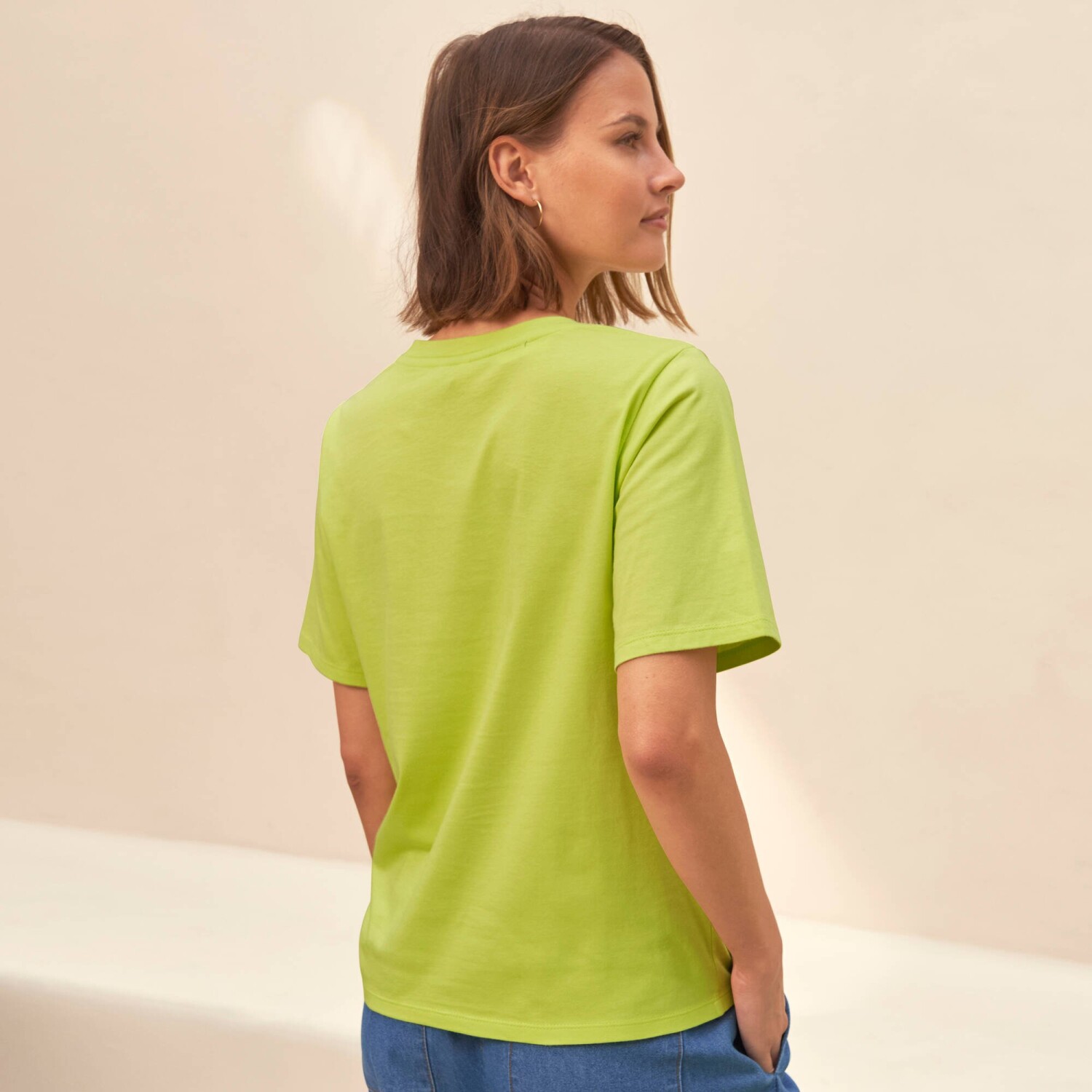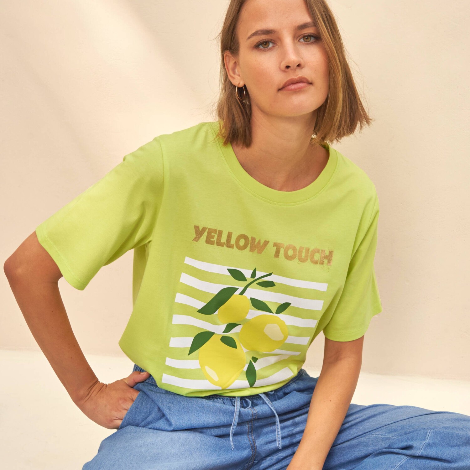 Šťavnaté farby pre Váš ležérny vzhľad! Toto tričko si zaslúži Vašu pozornosť! Voľný strih. Vzdušný úplet. Okrúhly výstrih. Krátke rukávy s ohrnutím. Rovný dolný lem. Standard 100 by Oeko-Tex (n° CQ 1216 / 3 IFTH). Táto známka označuje textilné výrobky, ktoré boli podrobené laboratórnym testom na široké spektrum škodlivých látok a výrobok je bezpečný nad rámec platných noriem. Možno prať v práčke.