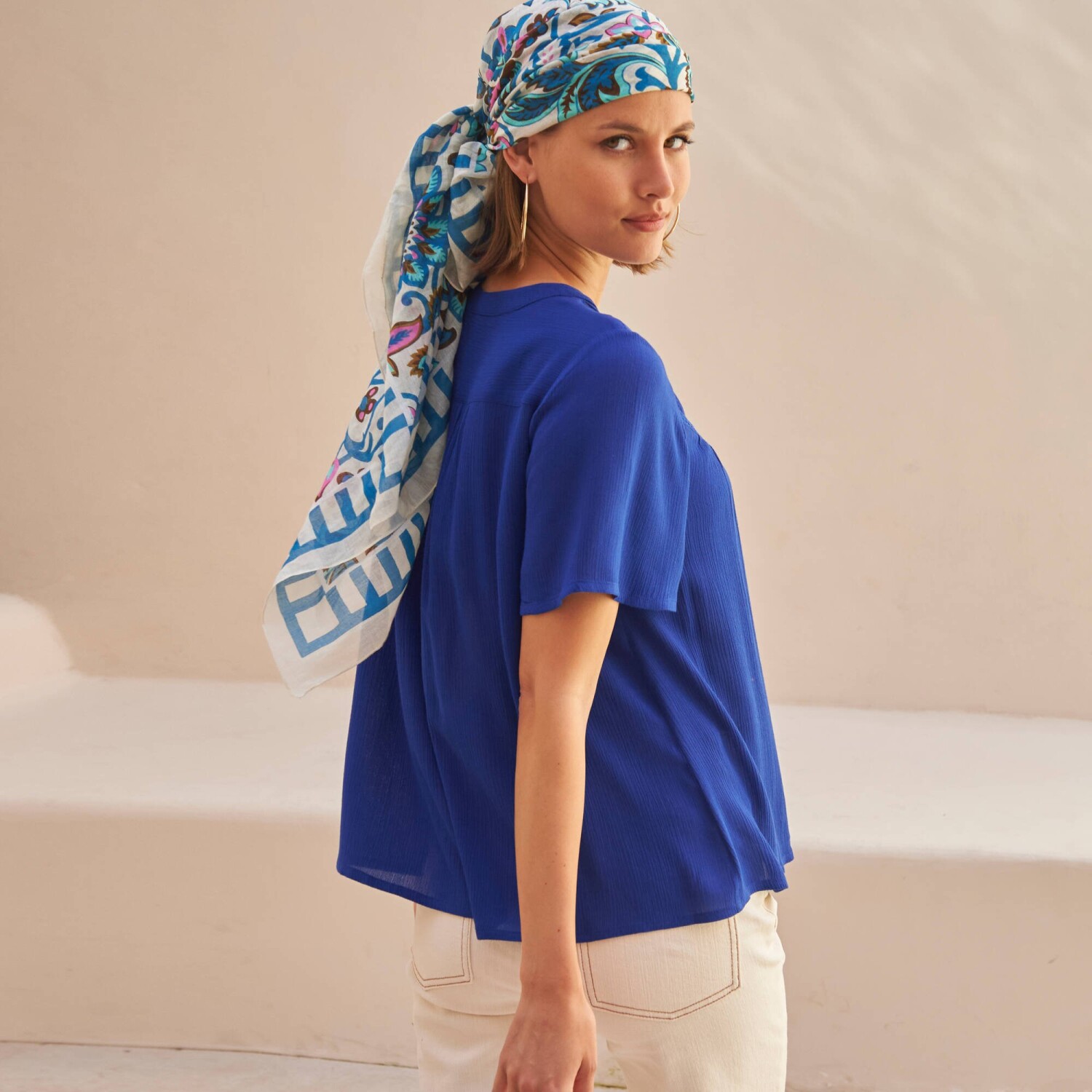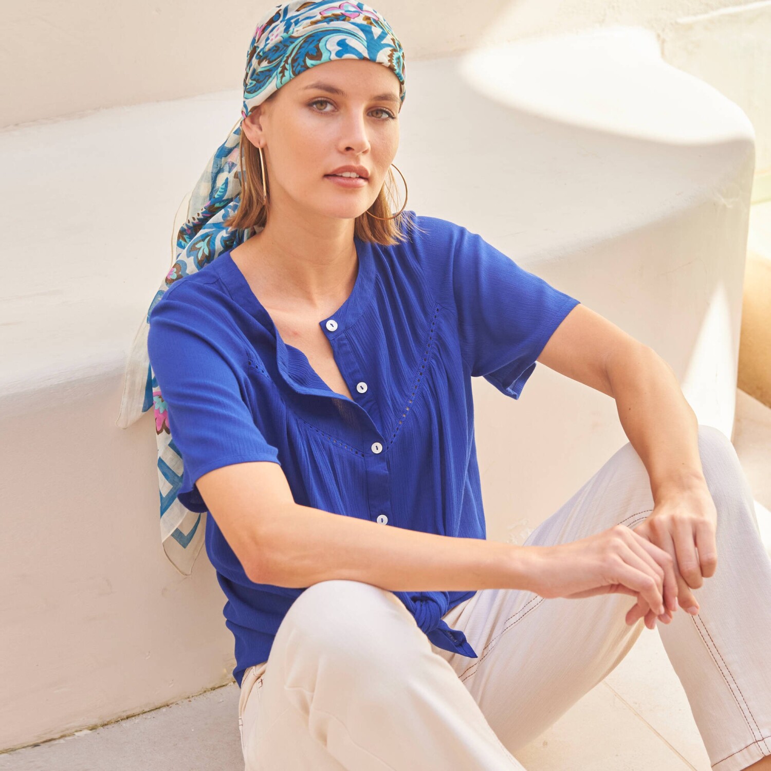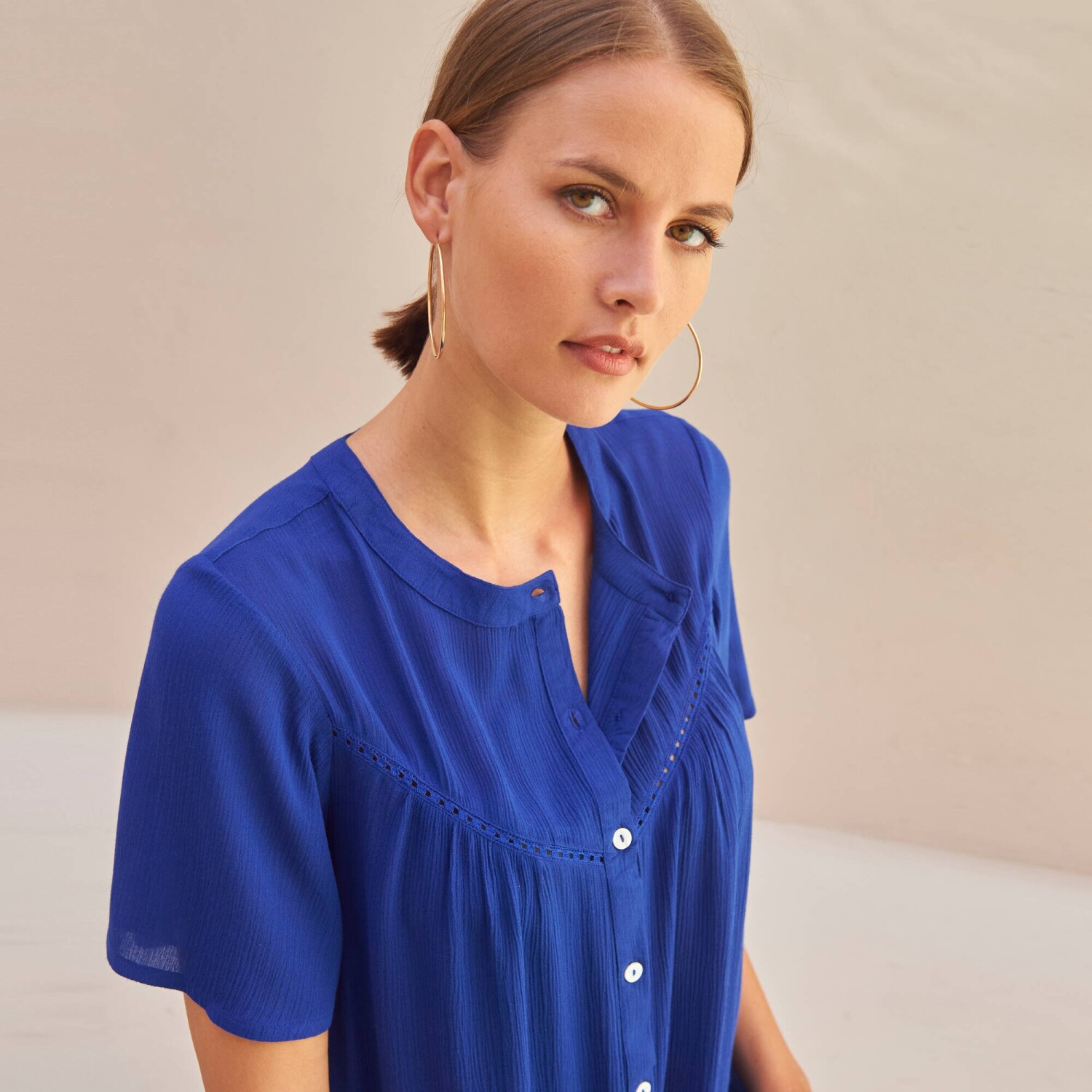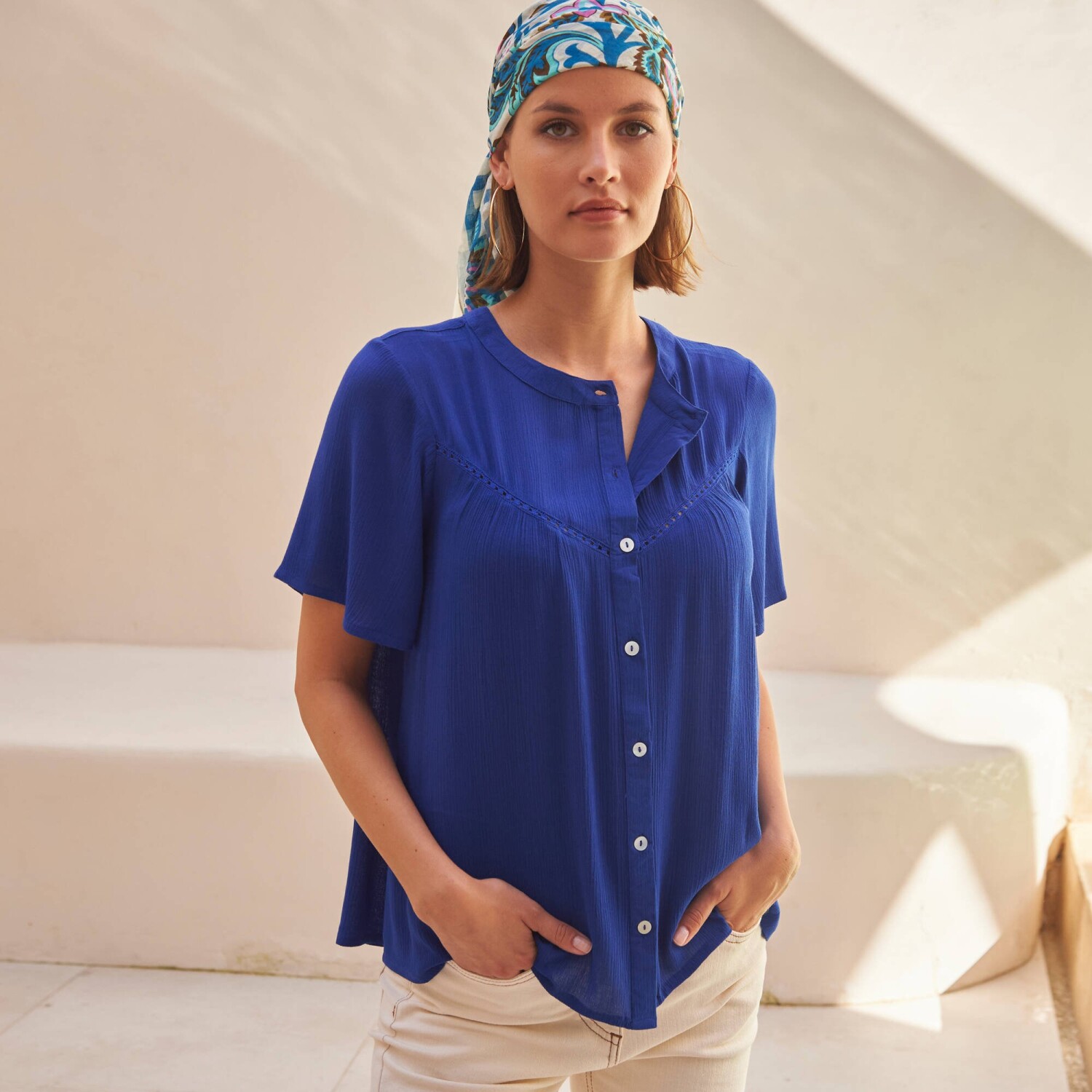 Blúzku v iskrivých farbách ľahko skombinujete a príjemne sa nosí. V mestskom modernom štýle. Z jemného materiálu s ľahkou údržbou. Okrúhly výstrih. Vpredu zapínanie na zladené gombíky. Ažúrový lem pod sedlom vpredu. Krátke motýlie rukávy s volánom. Vzadu nariasenie. Rovný dolný lem. Možno prať v práčke.